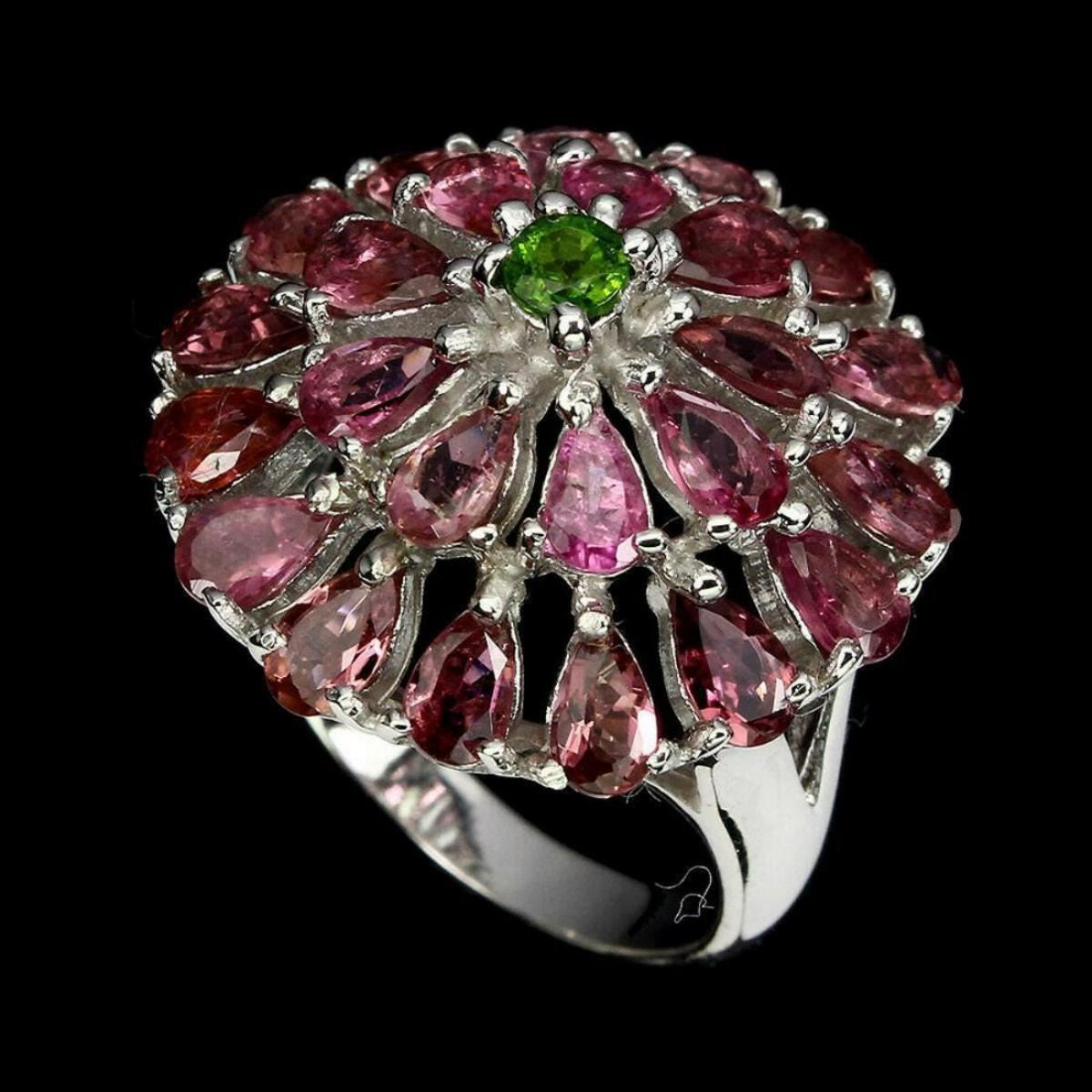 925 STERLING SILVER;PLATE-14K WHITE GOLD;RING SIZE(resizeable)8;MAIN STONE-TOURMALINE;OTHER GEMS-CHROME DIOPSIDE;TOTAL WEIGHT-4.53 GRAM (TOTAL WEIGHT OF SILVER + STONE)DIMENSION-* STONE 1.5 TO 6.0 X 4.0 MM. * RING SIZE 8.0 * FACE RING 27.0 X 22.0 MM.;MAIN STONE SHAPE-PEAR CUT;MAIN STONE COLOR-TOP RICH PINK;CLARITY/GRADE-IF TO VVS;TREATMENT-UNHEATED;ORIGIN-BRAZIL; HARDNESS7.0-7.5