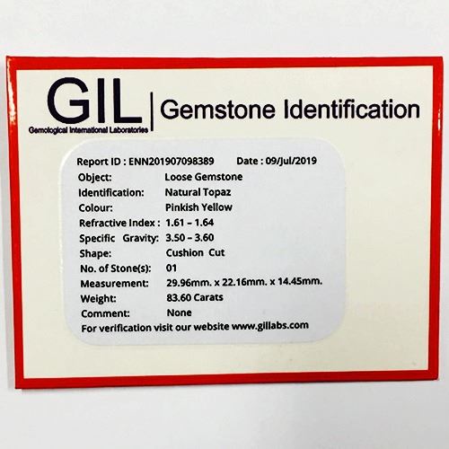 Natural Topaz (Certified) WEIGHT : 83.60 cts; SHAPE : Cushion; SIZE ( L x W x D ) : 29.96 x 22.16 x 14.45 mm QUANTITY : 1 piece COLOR : Pinkish Yellow (Natural Color) CLARITY : Flawless-VVS1 AAA Grade ORIGIN : Brazil HARDNESS : 8 LUSTER : Excellent!!! TREATMENT : Unheated & Untreated 100% Natural