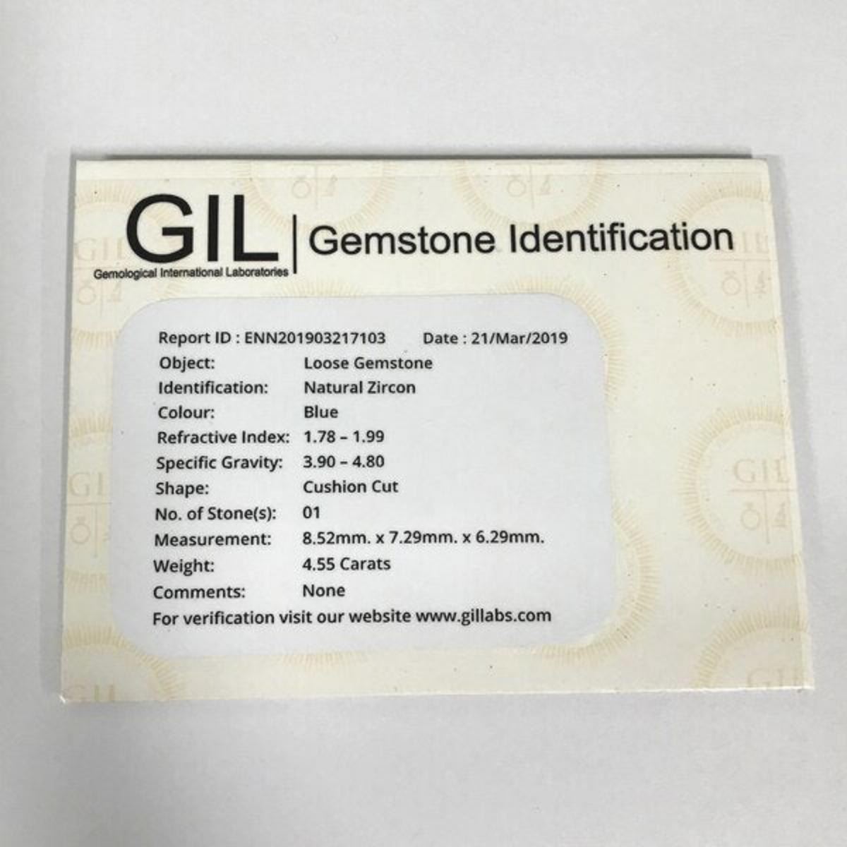 WEIGHT : 4.55 cts;STONE NAME : Natural Zircon (Earthly Mined)SIZE ( L x W x D ) : 8.52 x 7.29 x 6.29 mm;COLOR : Electric Blue Premium Color;SHAPE : Cushion;QUANTITY : 1 pieceLUSTER : Extreme Brilliancy;CLARITY : FLAWLESS-VVS1 ;HARDNESS : 7.5;ORIGIN : Cambodia;