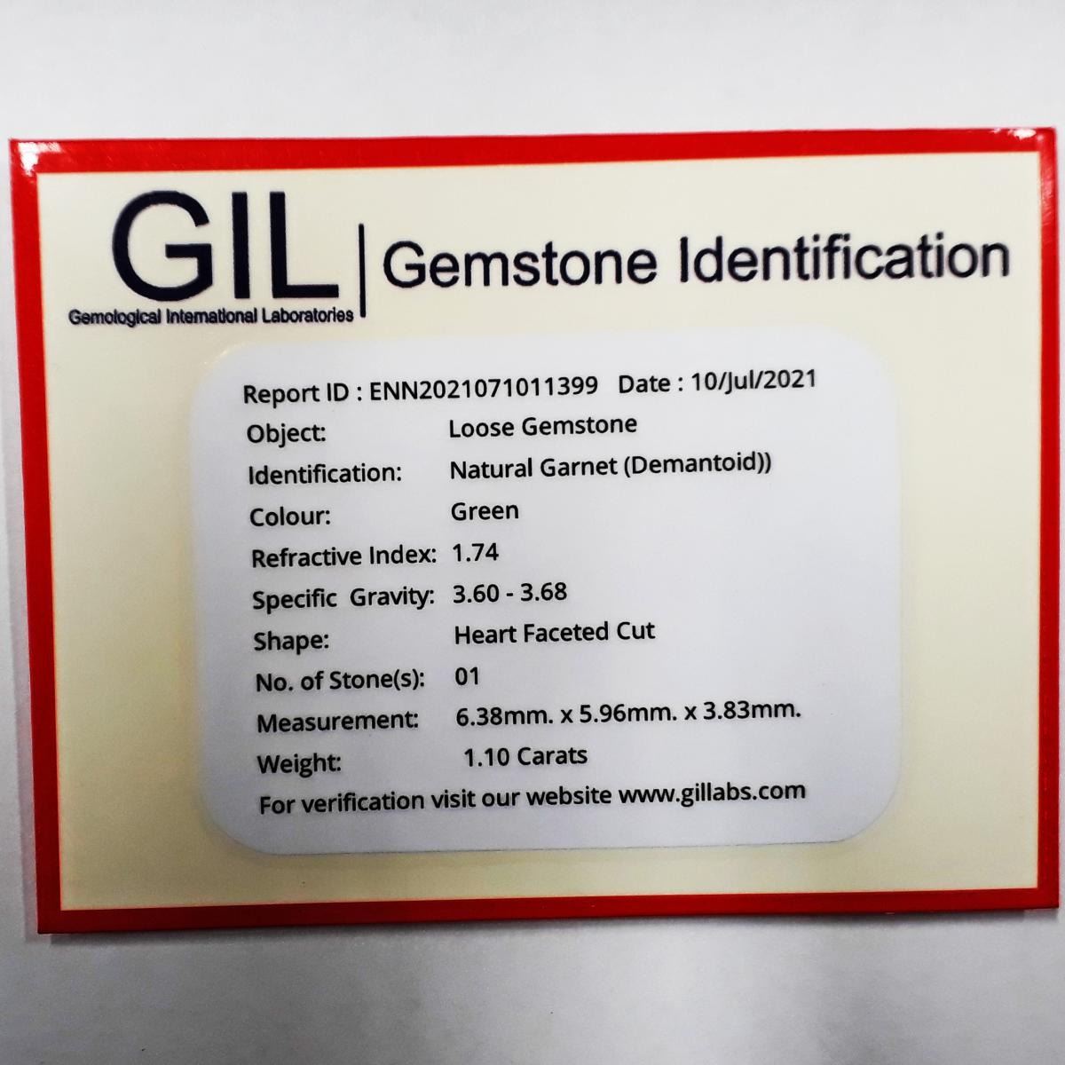 Natural Demantoid..........Certified; WEIGHT : 1.10 cts; SHAPE : Heart; SIZE ( L x W x D ) : 6.38 x 5.96 x 3.83 mm; QUANTITY : 1 pieces ; COLOR : Premium Green AAA Color; CLARITY : VVS AAA Grade; ORIGIN : Ural Mountains , Russia; HARDNESS : 7; LUSTER : AAA Fire!!! TREATMENT : 100% Natural Unheated;