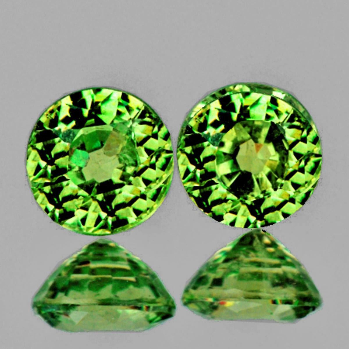 Natural Demantoid; WEIGHT : 1.15 cts; SHAPE : Round; SIZE ( L x W x D ) : 4.90 mm; QUANTITY : 2 pieces (Perfectly Matched Pair) COLOR : Premium Green ; CLARITY : Flawless-VVS AAA Grade; ORIGIN : Ural Mountains , Russia; HARDNESS : 7; LUSTER : Excellent!!! TREATMENT : 100% Natural Unheated;