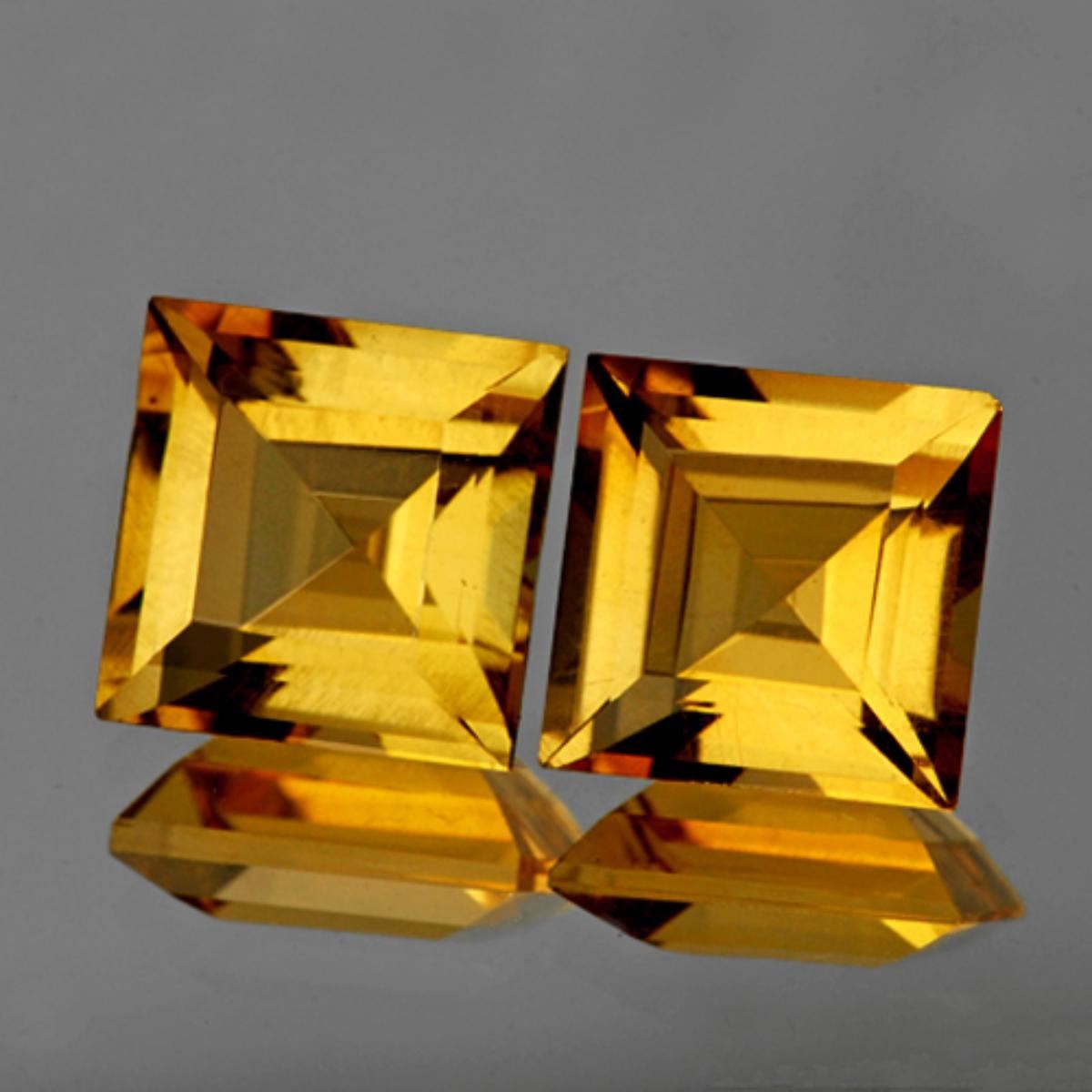 Natural Citrine ....SHAPE : Square/Princess cut; SIZE ( L x W x D ) : 8.00 mm QUANTITY : 2 pieces (Perfectly Matched Pair) COLOR : AAA Golden Yellow CLARITY : IF-VVS1 ORIGIN : Africa HARDNESS : 7 LUSTER : Excellent!!! TREATMENT : 100% Natural Unheated