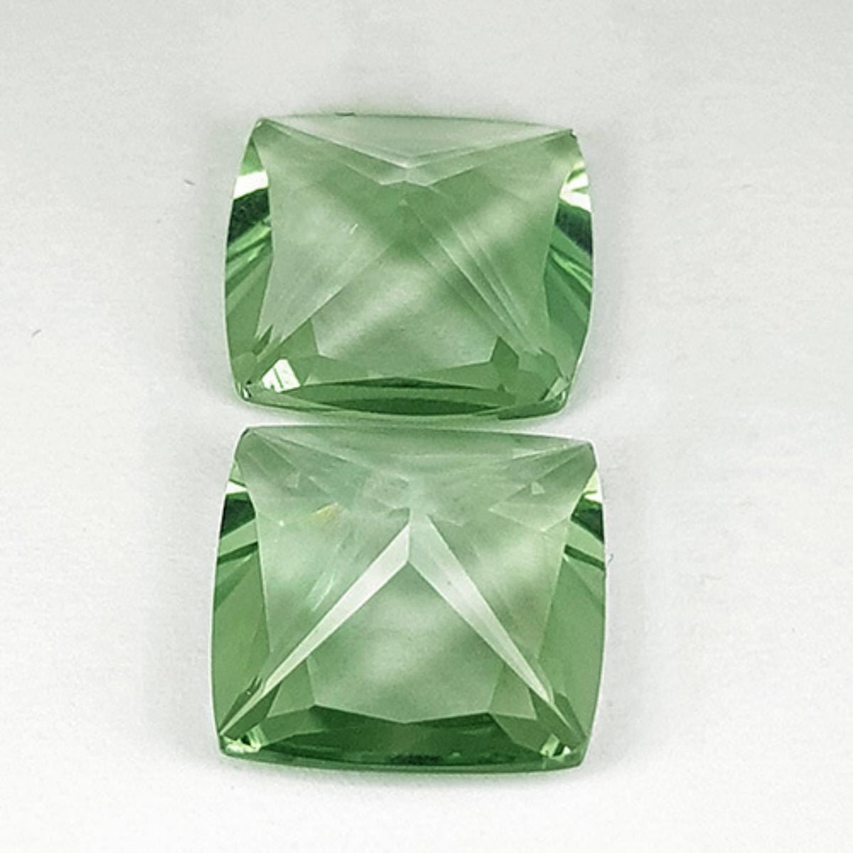 Natural Green Amethyst WEIGHT : 14.50- cts; SHAPE : Sqaure Cushion (Princess Cut) SIZE ( L x W x D ) : 14.00 mm; QUANTITY : 2 pieces (Perfect Matching Pair) COLOR : Nice Green; CLARITY : Flawless-VVS1; ORIGIN : Africa; HARDNESS : 7; LUSTER : Excellent!!! TREATMENT : Unheated 100% Natural;