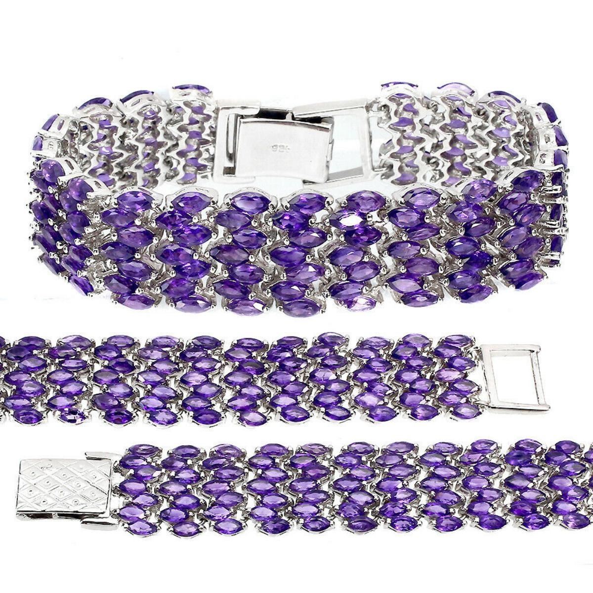 925 STERLING SILVER;PLATE-14K WHITE GOLD;LENGTH (INCHES)-7;MAIN STONE-AMETHYST;TOTAL WEIGHT-33.99 GRAM (TOTAL WEIGHT OF SILVER + STONE);DIMENSION-* STONE 5.0 X 2.5 MM. * LENGTH 7.0 INCHES.* FACE BRACELET 170.0 X 16.0 MM.;MAIN STONE SHAPE-MARQUISE CUT;MAIN STONE COLOR- PURPLE;CLARITY/GRADE-IF TO VVS;TREATMENT-UNHEATED;ORIGIN-URUGUAY;HARDNESS-7;