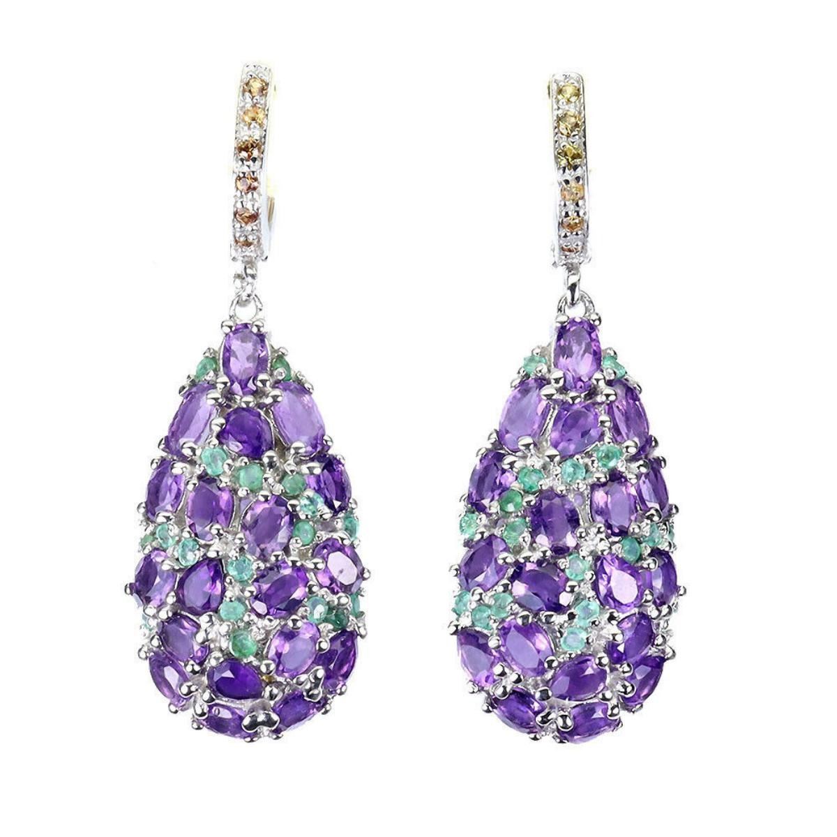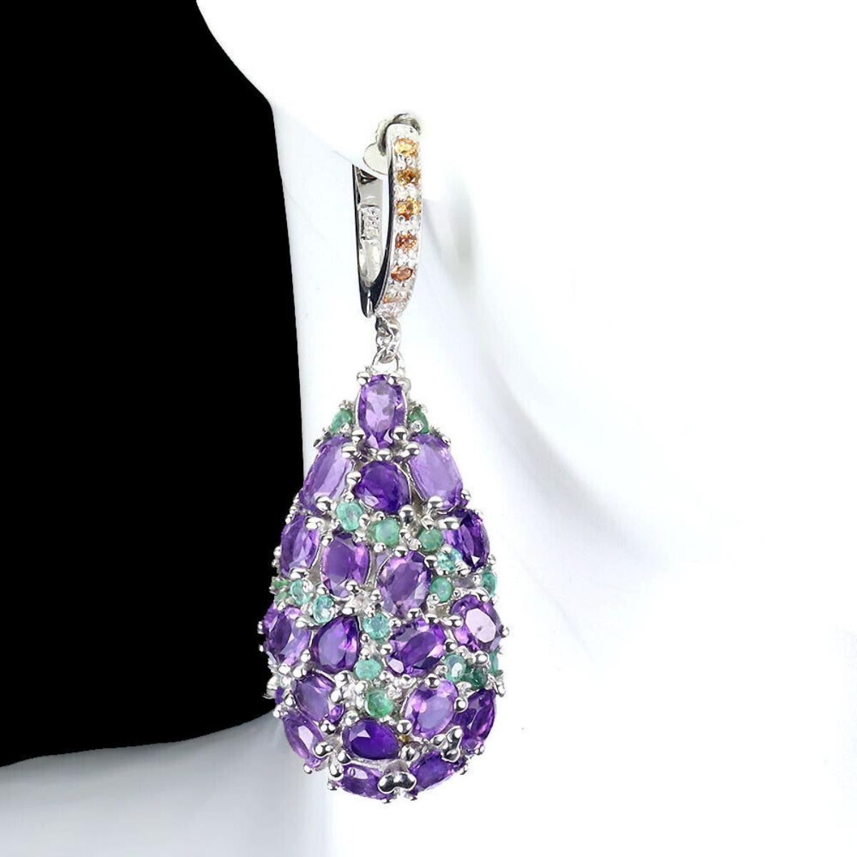 925 STERLING SILVER;PLATE-14K WHITE GOLD;MAIN STONE-AMETHYST;OTHER GEMS-EMERALD;TOTAL WEIGHT-8.88 GRAM (TOTAL WEIGHT OF SILVER + STONE)DIMENSION-* STONE 1.0 TO 5.0 X 3.0 MM.;* FACE EARRINGS- 44.0 X 16.0 MM.;MAIN STONE SHAPE-OVAL CUT;MAIN STONE COLOR- RICH PURPLE;CLARITY/GRADE-IF TO VVS;TREATMENT-UNHEATED;ORIGIN-URUGUAY;HARDNESS-7;