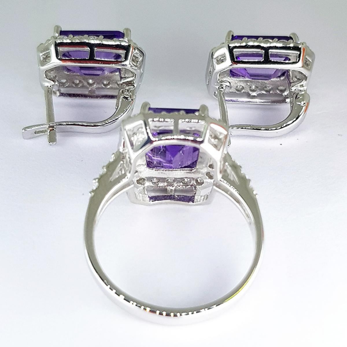 ewelry Set (Ring + Earring)Metal Type925 Sterling SilverPlate14K White GoldTotal Jewelry Weight11.91 grams or 59.55cts(Ring + Earring) Ring Detail Ring Weight5.00 grams or 25.00ctsRing Size7.00 US (resizeable)Ring DimensionFace Ring 15.00 x 14.00 mm.Main StoneNatural Purple AmethystRectangle 11x8mm 1 piece Flawless-VVS1Other StonesCubic Zirconia Round 1.00mm Flawless-VVS1 Earring Details Earring Weight6.91grams or 34.55ctsEarring SizeFace Earring 15.00mm x 13.00 mm.Main StoneNatural Purple AmethystRectangle 11x8mm 2 pieces Flawless-VVS1Other StonesCubic Zirconia Round 1.00mm Flawless-VVS1