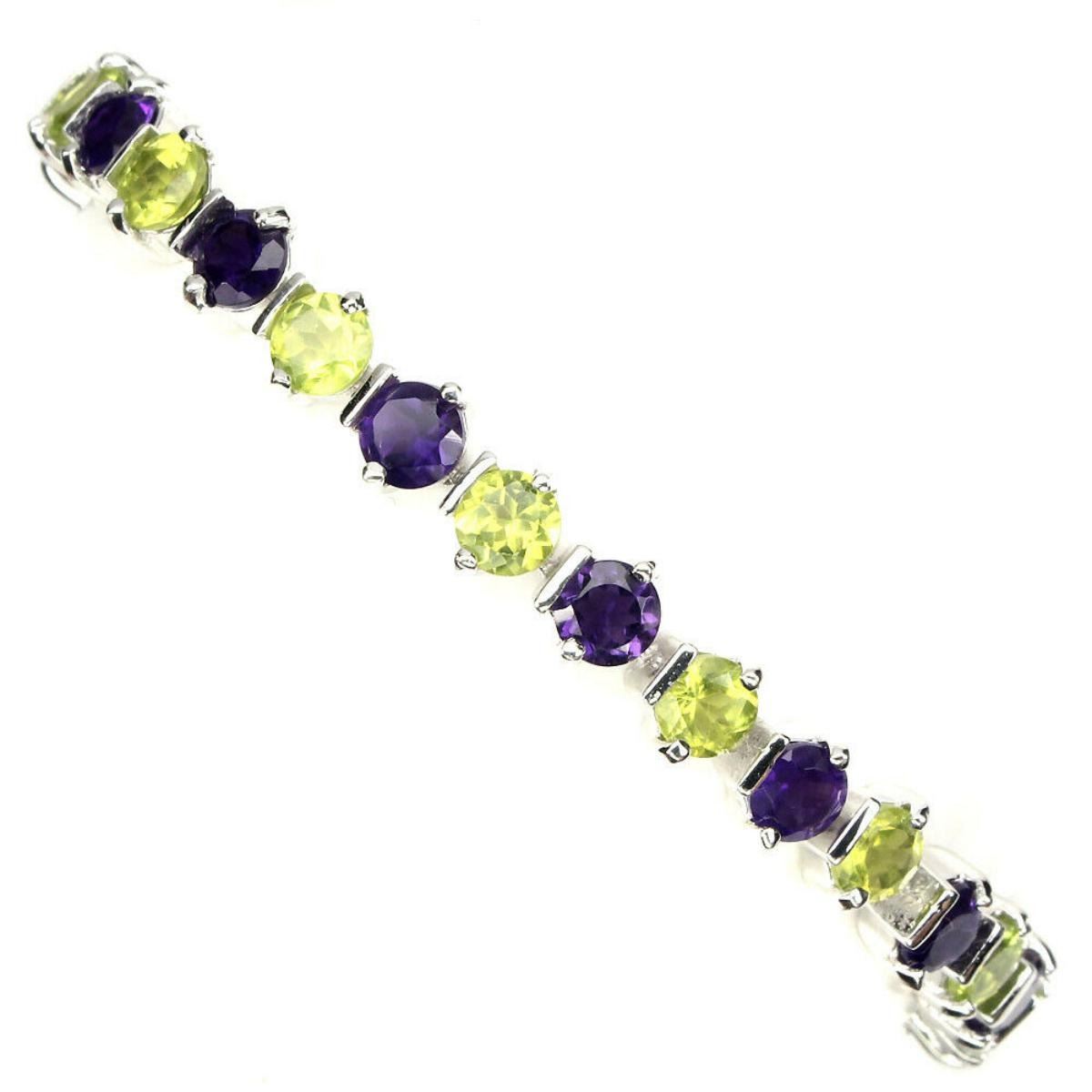 925 STERLING SILVER;PLATE14K WHITE GOLD;LENGTH (INCHES)7.5;MAIN STONE-AMETHYST;OTHER GEMS-PERIDOT;TOTAL WEIGHT-88.46 CT (TOTAL WEIGHT OF SILVER + STONE)DIMENSION* STONE 5.0 MM. * FACE BRACELET 175.0 X 7.0 MM.MAIN STONE SHAPE-ROUND CUT;MAIN STONE COLOR-TOP INTENSE PURPLE;CLARITY/GRADE-IF TO VVS;LUSTER-PRECIOUS;TREATMENT-UNHEATED;ORIGIN-Brazil, Pakistan;HARDNESS7;