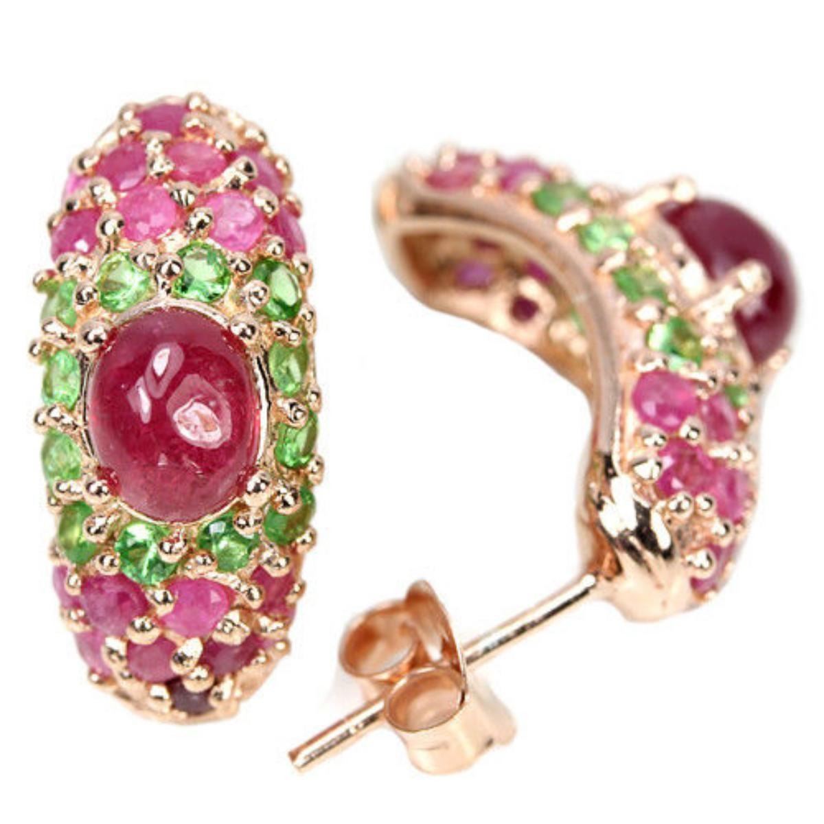 GENUINE RED RUBY OVAL & TSAVORITE GARNET 925 SILVER EARING 14K PINK GOLD COATING;STONE SHAPEOVAL CABOCHON CUTSTONE DIMENSION7 X 5 MM.ITEM WEIGHT6.4 GRAMCOLORREDCLARITYTRANSLUCENTLUSTERALLURINGTREATMENTHEATEDORIGIN OF STONEAFRICAHARDNESS9.0;FACE OF EARRING 20 X 9 MM. TSAVORITE GARNET & RUBY 2.2 MM. & 2 MM.