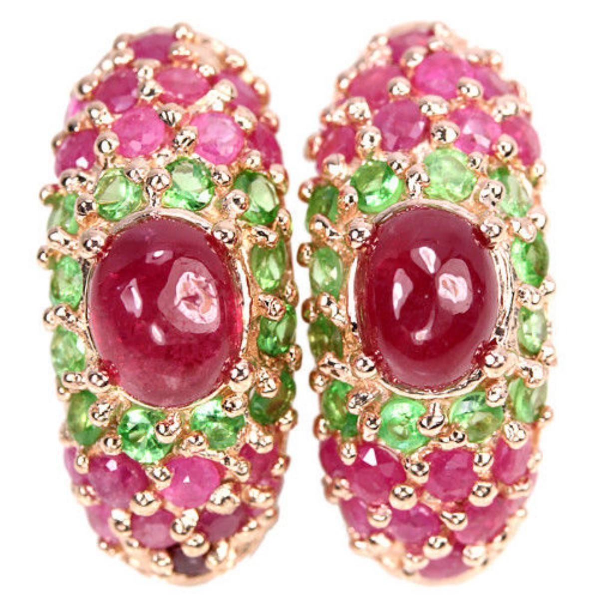 GENUINE RED RUBY OVAL & TSAVORITE GARNET 925 SILVER EARING 14K PINK GOLD COATING;STONE SHAPEOVAL CABOCHON CUTSTONE DIMENSION7 X 5 MM.ITEM WEIGHT6.4 GRAMCOLORREDCLARITYTRANSLUCENTLUSTERALLURINGTREATMENTHEATEDORIGIN OF STONEAFRICAHARDNESS9.0;FACE OF EARRING 20 X 9 MM. TSAVORITE GARNET & RUBY 2.2 MM. & 2 MM.