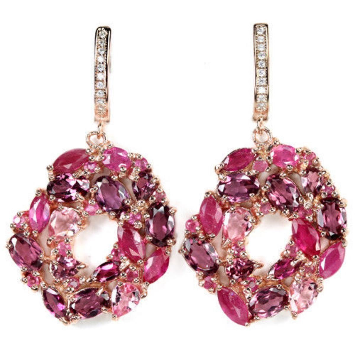 RHODOLITE GARNET RUBY TOURMALINE CZ 925SILVER EARRING 14K PINK GOLD COATING; STONE DIMENSION6 X 4 MM. , 6 X 3 MM. , 5 X 4 MM. , 5 X 2.5 MM. , 4 X 3 MM. , 1.7 MM.;ITEM WEIGHT11.9 GRAM;COLORMULTI COLOR;CLARITYVVS, VS - SI;LUSTERRAVISHING;TREATMENTUNHEATED & HEATED;ORIGIN OF STONEAFRICA;HARDNESS7.0 - 7.5FACE OF EARRING 41 X 23 MM. WHITE CUBIC ZIRCONIA 1.5 MM.