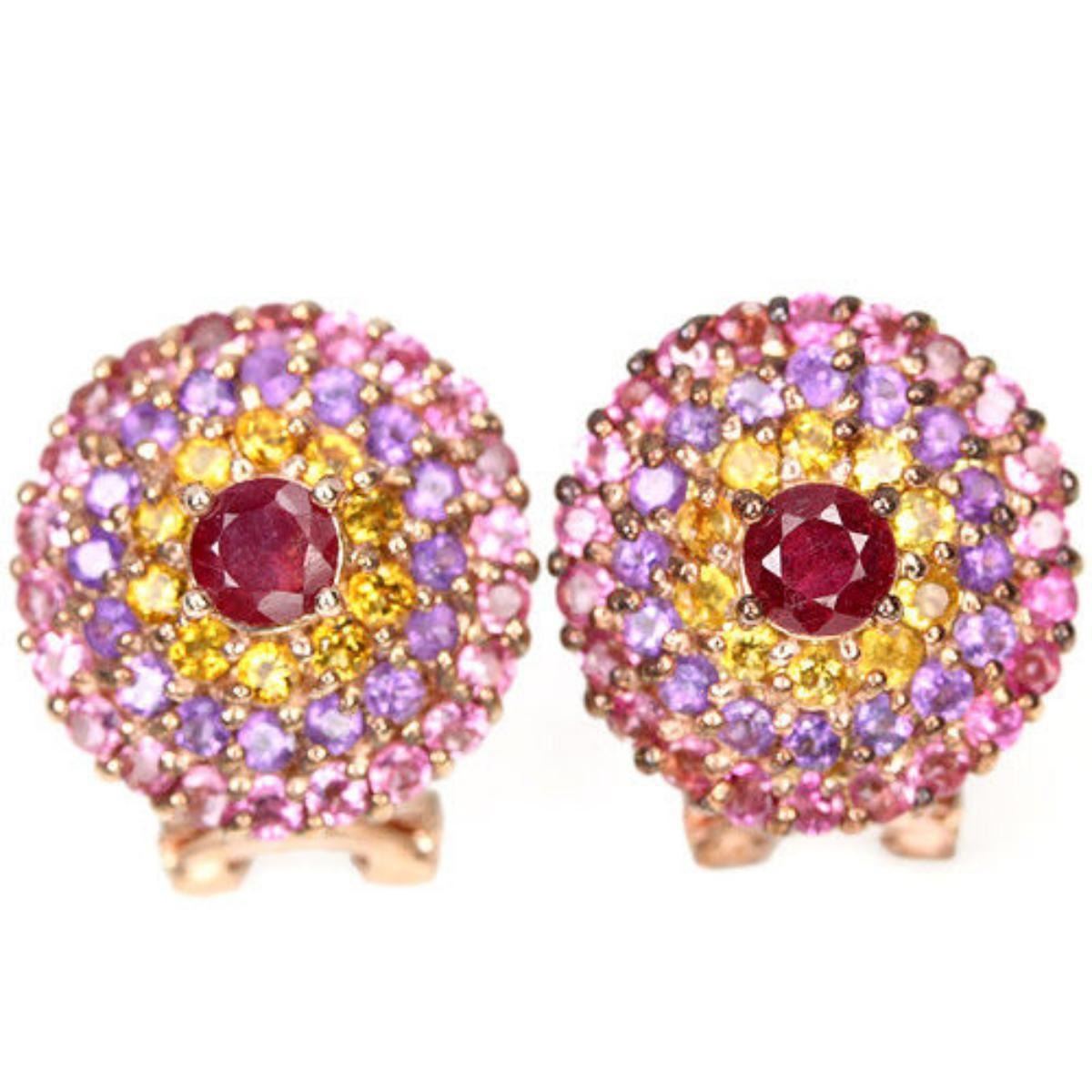 REAL RUBY CITRINE AMETHYST TOURMALINE 925 SILVER EARRING 14K PINK GOLD COATING; STONE SHAPE ROUND STONE DIMENSION 4 MM. , 2 MM. ITEM WEIGHT 8.2 GRAM COLOR MULTI COLOR CLARITY TRANSLUCENT VVS-SI LUSTER ELEGANT TREATMENT HEATED NATURAL UNHEATED ORIGIN OF STONE AFRICA BRAZIL HARDNESS 7 - 9 OTHER FACE OF EARRING 15 X 15 MM.