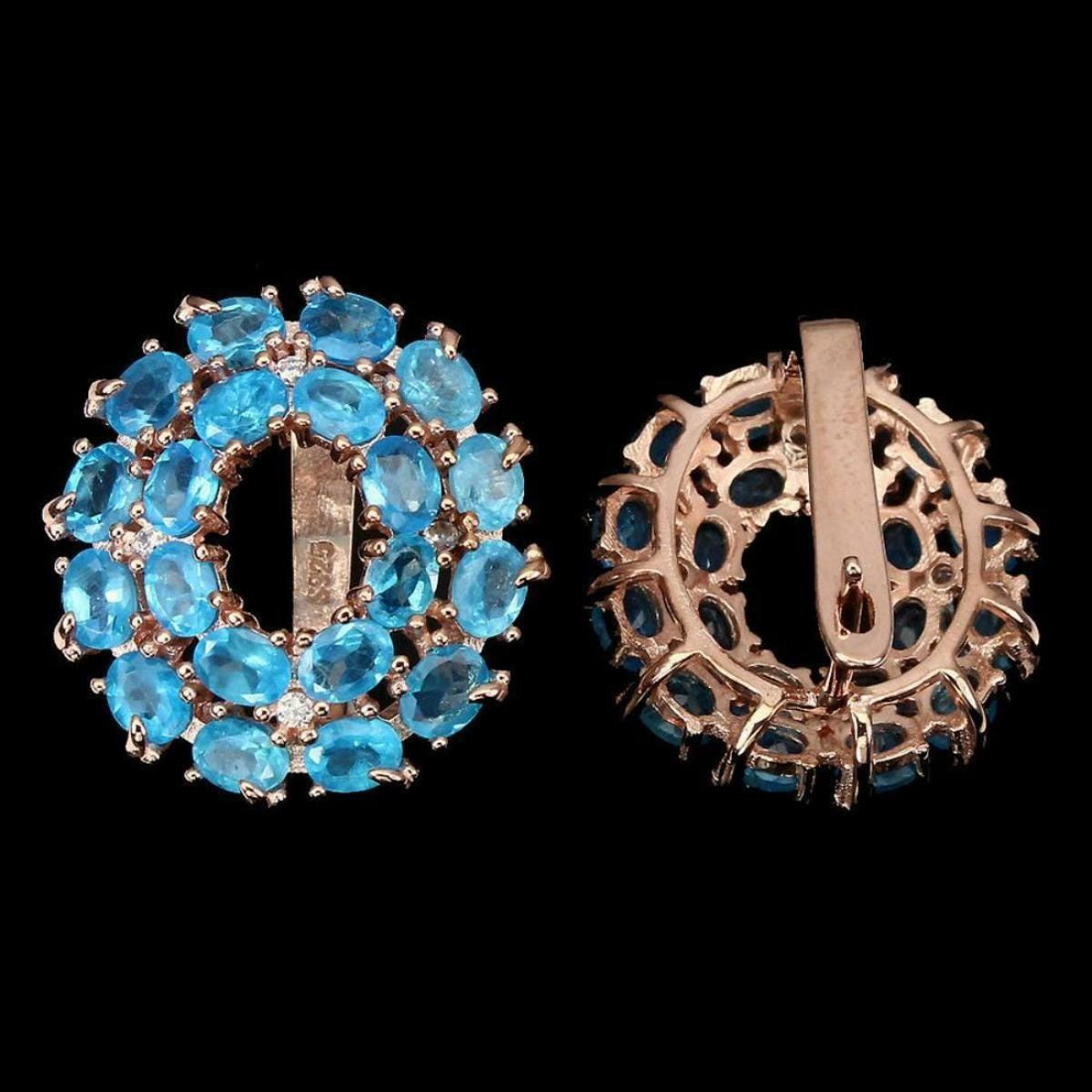 925 STERLING SILVER;PLATE14K ROSE GOLDMAIN STONEAPATITE;OTHER GEMSCUBIC ZIRCONIA;TOTAL WEIGHT42.46 CT (TOTAL WEIGHT OF SILVER + STONE)DIMENSION* STONE 4.0 X 3.0 MM. * CZ 1.5 MM. * FACE EARRINGS 22.0 X 20.0 MM.;MAIN STONE SHAPEOVAL CUT;MAIN STONE COLORAAA NEON BLUE;CLARITY/GRADEIF TO VVSLUSTERDELIGHTFUL;ORIGIN- Brazil;HARDNESS5