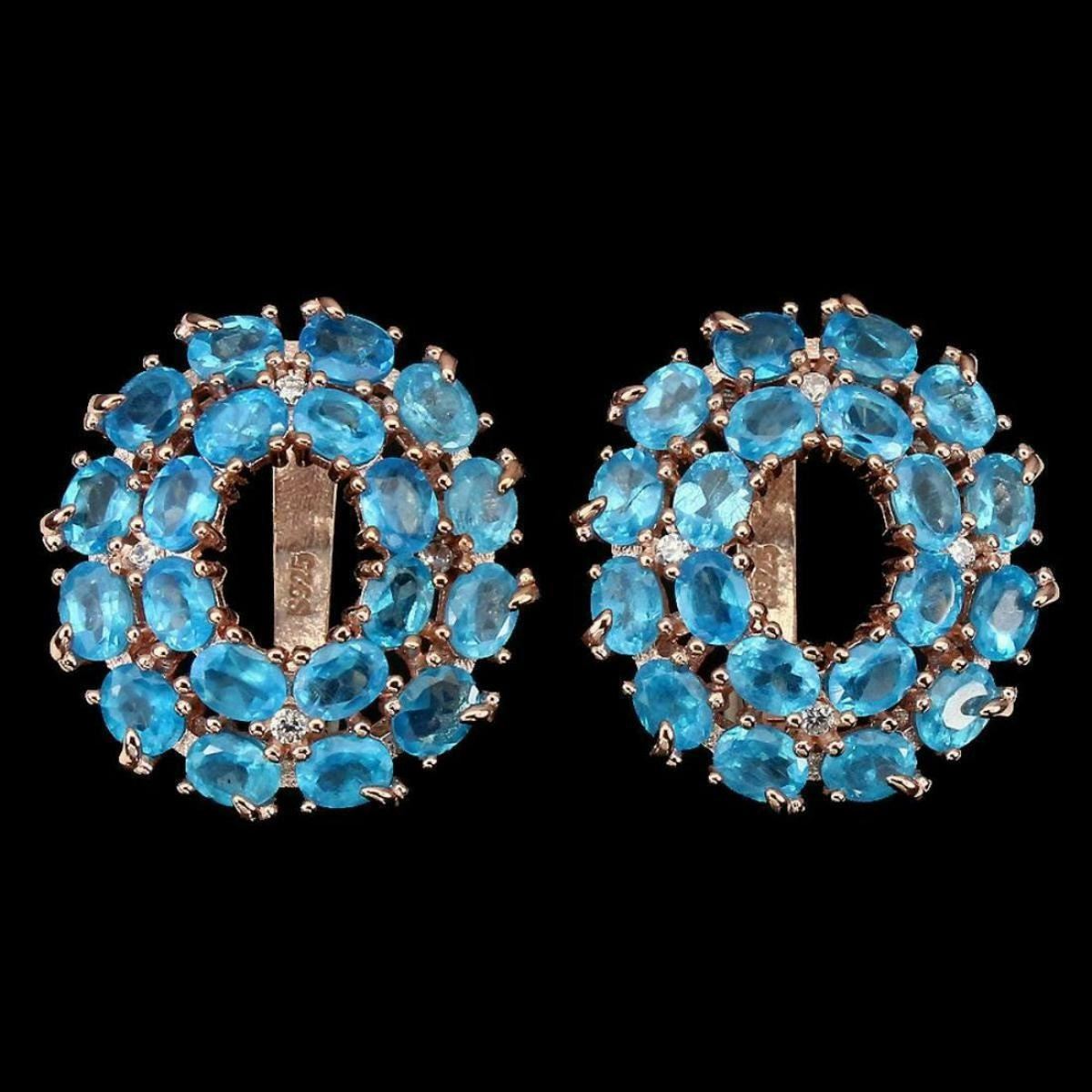 925 STERLING SILVER;PLATE14K ROSE GOLDMAIN STONEAPATITE;OTHER GEMSCUBIC ZIRCONIA;TOTAL WEIGHT42.46 CT (TOTAL WEIGHT OF SILVER + STONE)DIMENSION* STONE 4.0 X 3.0 MM. * CZ 1.5 MM. * FACE EARRINGS 22.0 X 20.0 MM.;MAIN STONE SHAPEOVAL CUT;MAIN STONE COLORAAA NEON BLUE;CLARITY/GRADEIF TO VVSLUSTERDELIGHTFUL;ORIGIN- Brazil;HARDNESS5