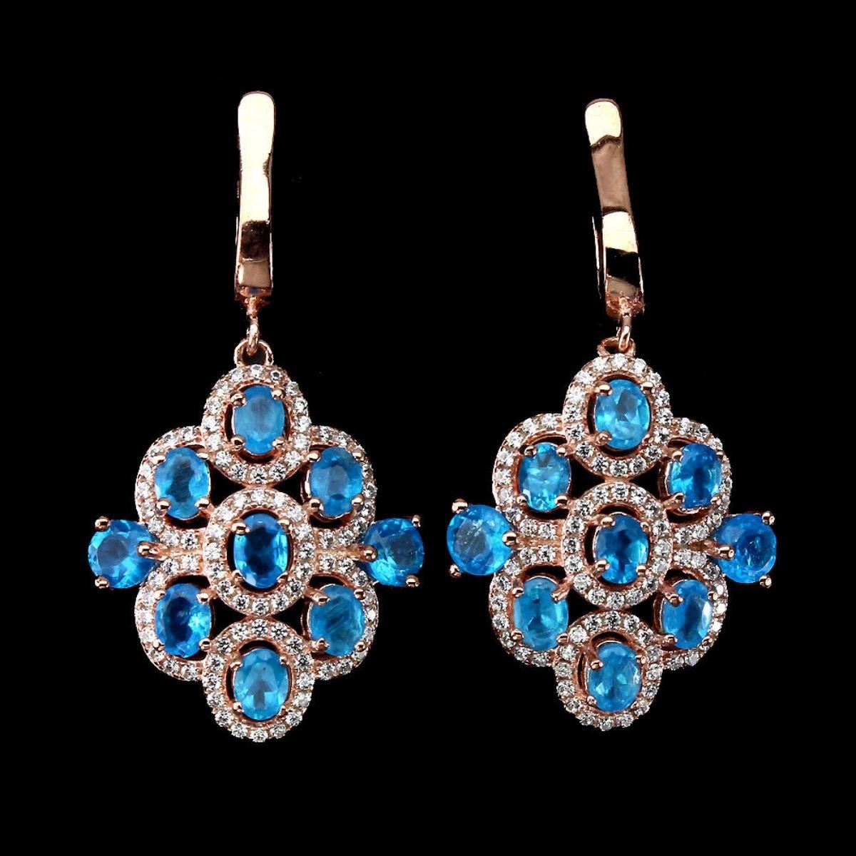 925 STERLING SILVER;PLATE.....14K ROSE GOLD;MAIN STONEAPATITE;OTHER GEMSCUBIC ZIRCONIA;TOTAL WEIGHT44.93 CT (TOTAL WEIGHT OF SILVER + STONE)DIMENSION* STONE 4.0 TO 4.0 X 3.0 MM. * CZ 1.0 MM. * FACE EARRINGS 39.0 X 19.0 MM.;MAIN STONE SHAPEOVAL CUT;MAIN STONE COLORAAA NEON BLUE;CLARITY/GRADEIF TO VVS;LUSTERGORGEOUS;TREATMENTUNHEATED;ORIGIN- Brazil;HARDNESS5.0;