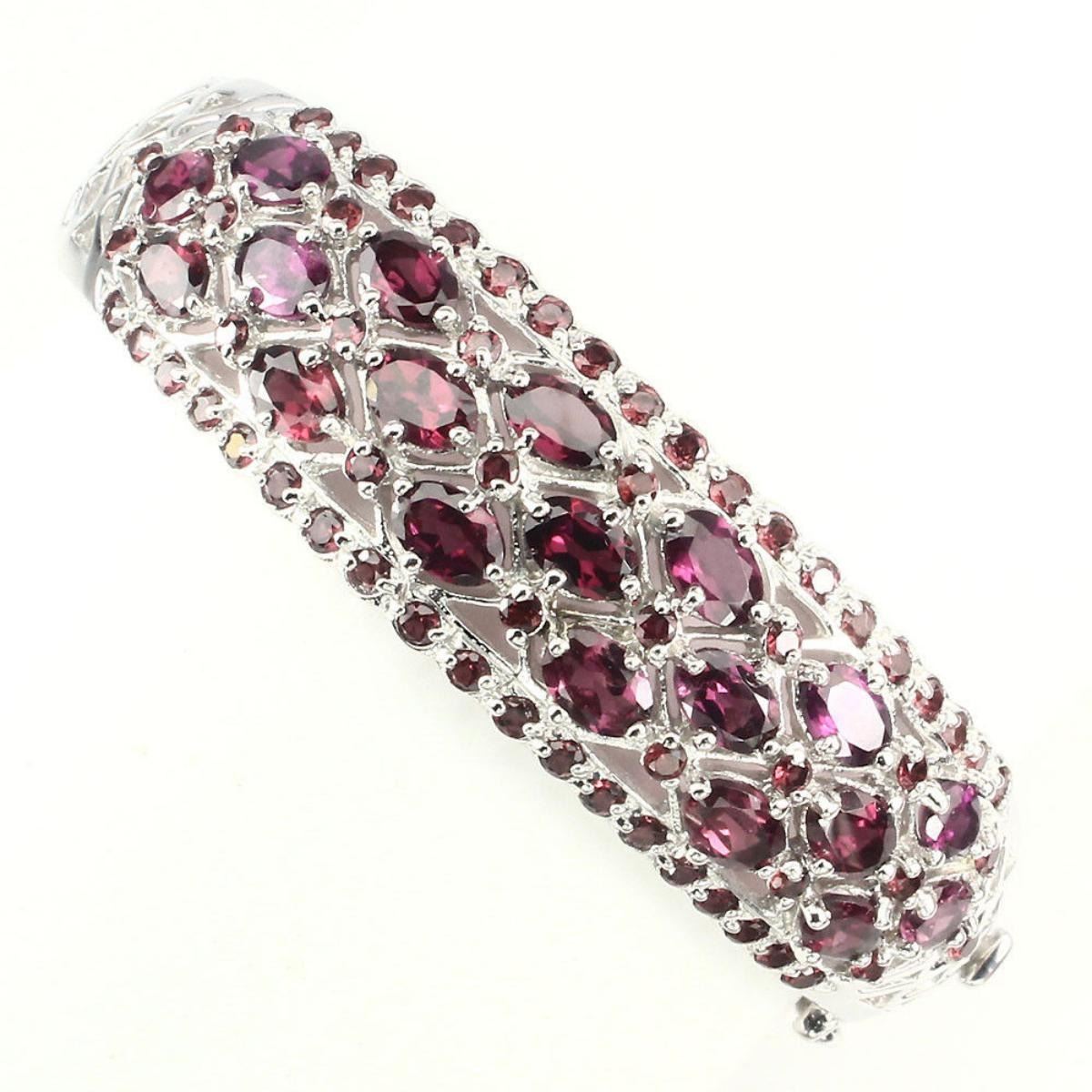 925 STERLING SILVER; PLATE -14K WHITE GOLD; MAIN STONE -RHODOLITE GARNET; OTHER GEMS -MOZAMBIQUE GARNET; TOTAL WEIGHT -132.39 CT (TOTAL WEIGHT OF SILVER + STONE) DIMENSION * STONE 2.0 TO 6.0 X 4.0 MM. * DIAMETER 2.0 INCHES. * FACE BANGLE 57.0 X 17.0 MM. MAIN STONE SHAPE OVAL CUT; MAIN STONE COLOR -TOP RICH PINK RASPBERRY; CLARITY/GRADE -IF TO VVS; LUSTER MESMERIZING TREATMENT -UNHEATED; ORIGIN AFRICA HARDNESS 7.0 - 7.5