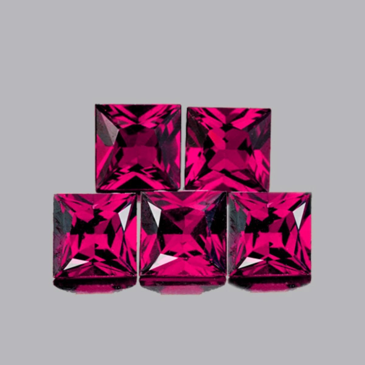 Natural Rhodolite Garnet WEIGHT : 2.05 cts SHAPE : Square (Princess Cut) SIZE ( L x W x D ) : 4.00 mm QUANTITY : 5 pieces COLOR : Raspberry Pink CLARITY : Flawless-VVS1 ORIGIN : Umba Valley, Tanzania HARDNESS : 7 LUSTER : Excellent!!! TREATMENT : 100% Natural Unheated