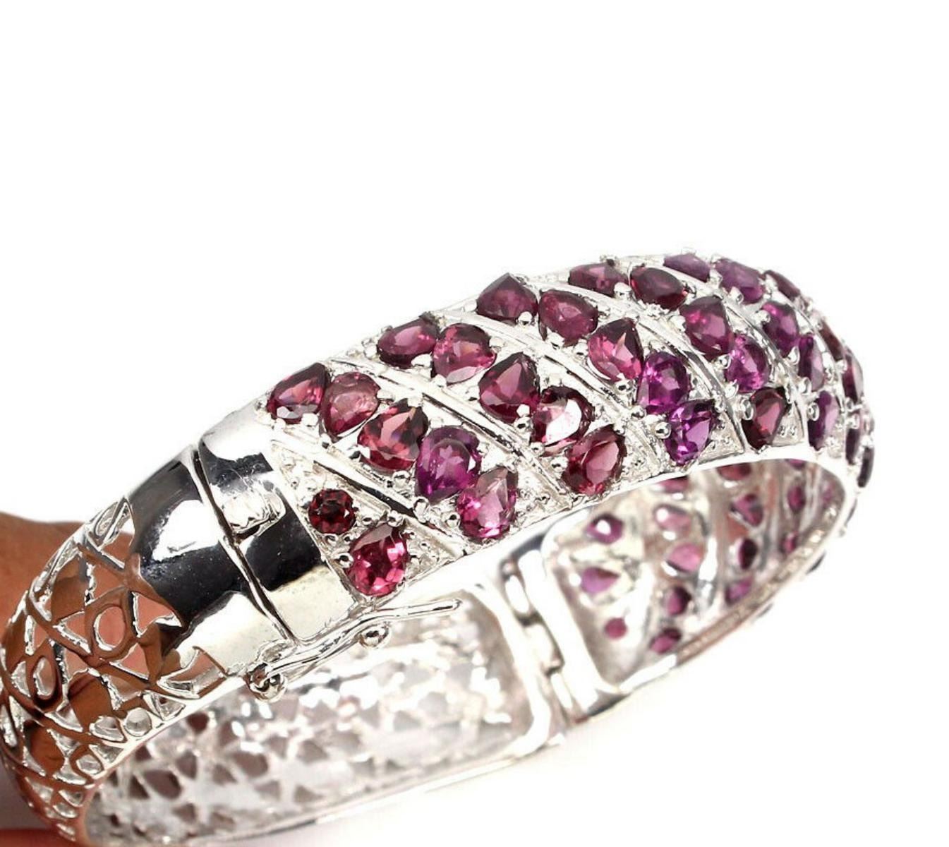 925 STERLING SILVER;PLATE14K WHITE GOLD;MAIN STONERHODOLITE GARNET;TOTAL WEIGHT206.20 CT (TOTAL WEIGHT OF SILVER + STONE)DIMENSION* STONE 3.0 TO 5.0 X 4.0 MM. * DIAMETER 2.2 X 2.1 INCHES. * FACE BANGLE 70.0 X 17.0 MM.;MAIN STONE SHAPEPEAR CUT;MAIN STONE COLORTOP RICH PINK RASPBERRY;CLARITY/GRADEIF TO VVS;LUSTERGRACEFULLY;TREATMENTUNHEATED;ORIGINAFRICA;HARDNESS7;