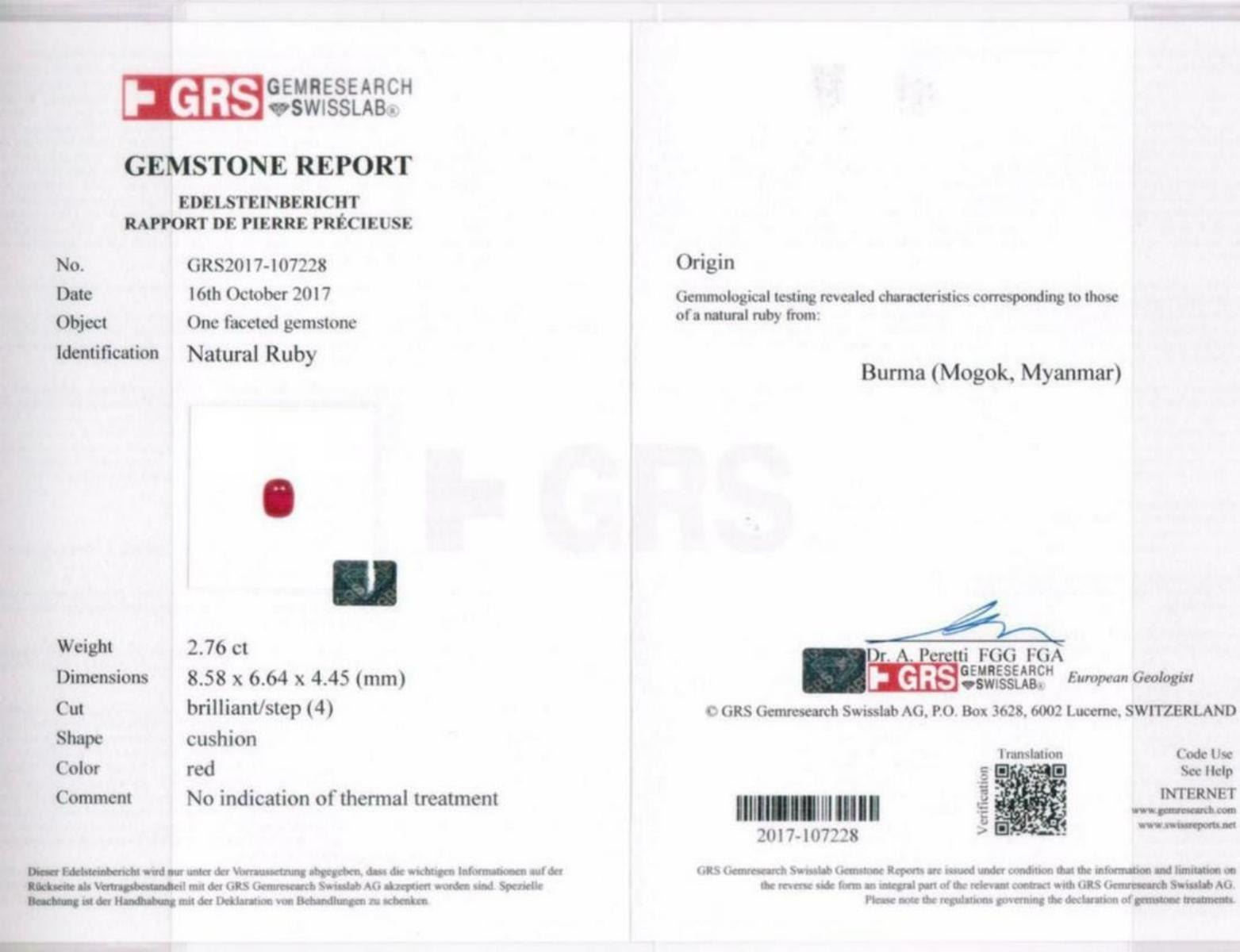 Natural Red Ruby Burma Origin 2.76 Cts - GRS Certified.....shape - Cushion......Clarity - VS/Eye Clean....Top Red Color....Origin - Burma