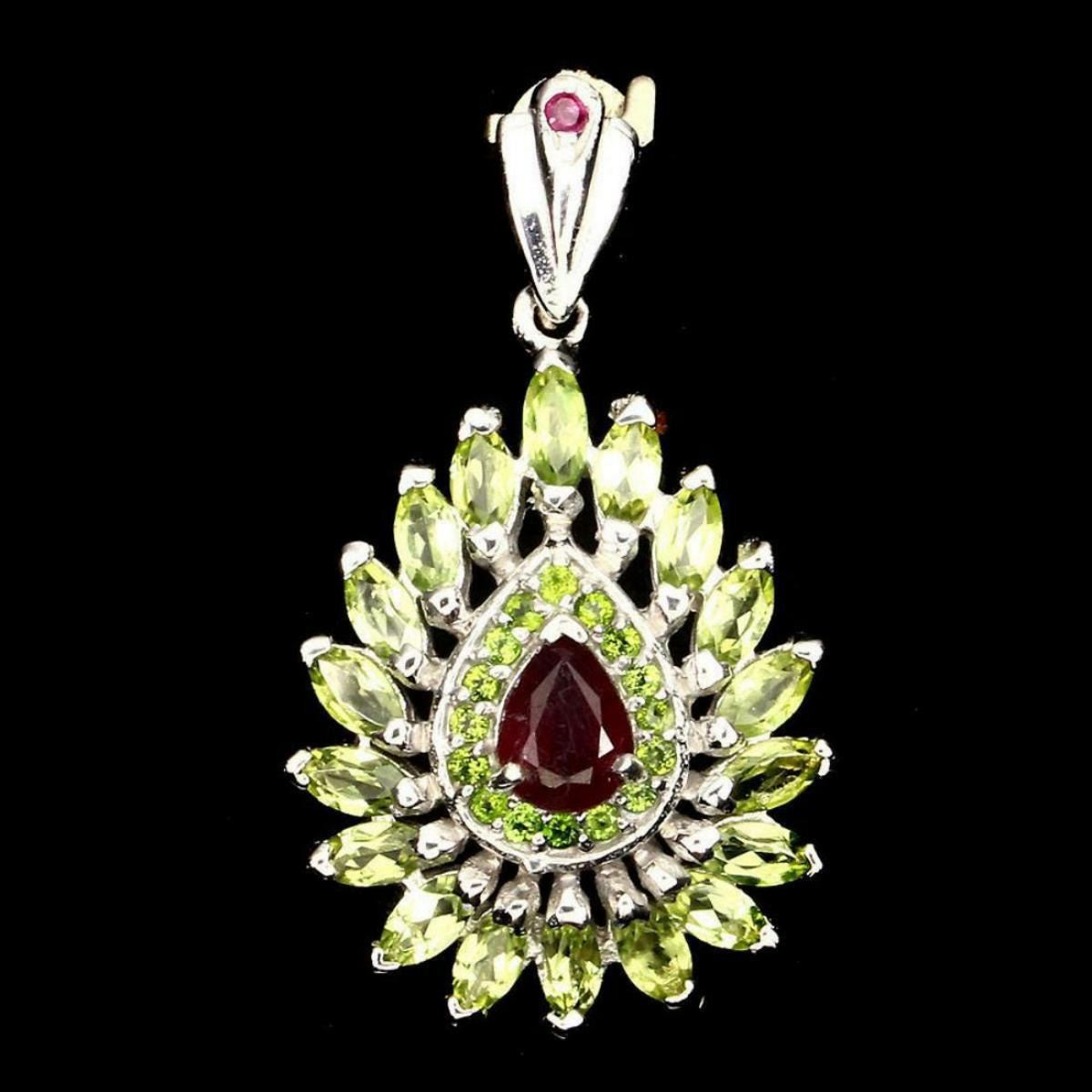 925 STERLING SILVER;PLATE14K WHITE GOLD;MAIN STONERUBYOTHER GEMSCHROME DIOPSIDE,PERIDOTTOTAL WEIGHT28.44 CT (TOTAL WEIGHT OF SILVER + STONE)DIMENSION* STONE 1.5 TO 7.0 X 5.0 MM. * FACE PENDANT 36.0 X 22.0 MM.MAIN STONE SHAPEPEAR CUTMAIN STONE COLORTOP BLOOD REDCLARITY/GRADE-TRANSPARENT;ORIGINMADAGASCARHARDNESS9