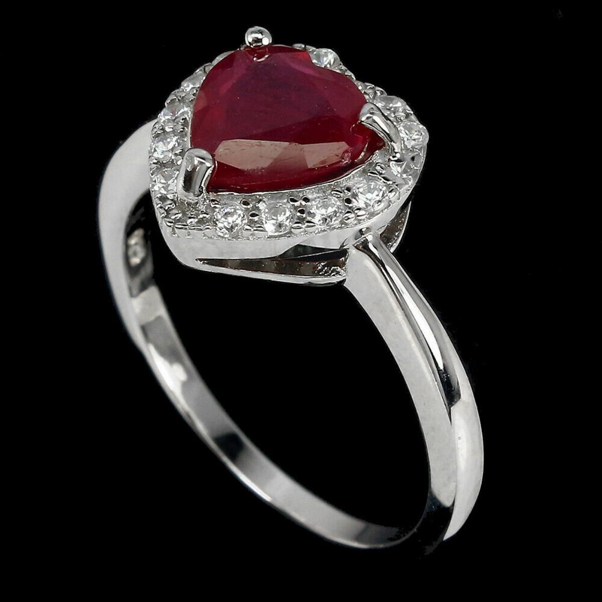 925 STERLING SILVER; PLATE -14K WHITE GOLD; RING SIZE 8(RESIZABLE); MAIN STONE RUBY; TOTAL WEIGHT 3.11 GRAM (TOTAL WEIGHT OF SILVER + STONE); DIMENSION * STONE 8.0 X 8.0 MM. * * RING SIZE 8.0 * FACE RING 11.0 X 11.0 MM.; MAIN STONE SHAPE HEART CUT; MAIN STONE COLOR BLOOD RED; Treatment- Yes ; ORIGIN MOZAMBIQUE; HARDNESS 9;