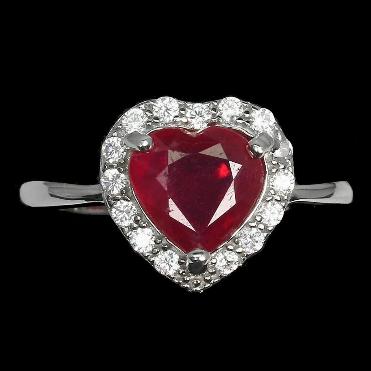925 STERLING SILVER; PLATE -14K WHITE GOLD; RING SIZE 8(RESIZABLE); MAIN STONE RUBY; TOTAL WEIGHT 3.11 GRAM (TOTAL WEIGHT OF SILVER + STONE); DIMENSION * STONE 8.0 X 8.0 MM. * * RING SIZE 8.0 * FACE RING 11.0 X 11.0 MM.; MAIN STONE SHAPE HEART CUT; MAIN STONE COLOR BLOOD RED; Treatment- Yes ; ORIGIN MOZAMBIQUE; HARDNESS 9;