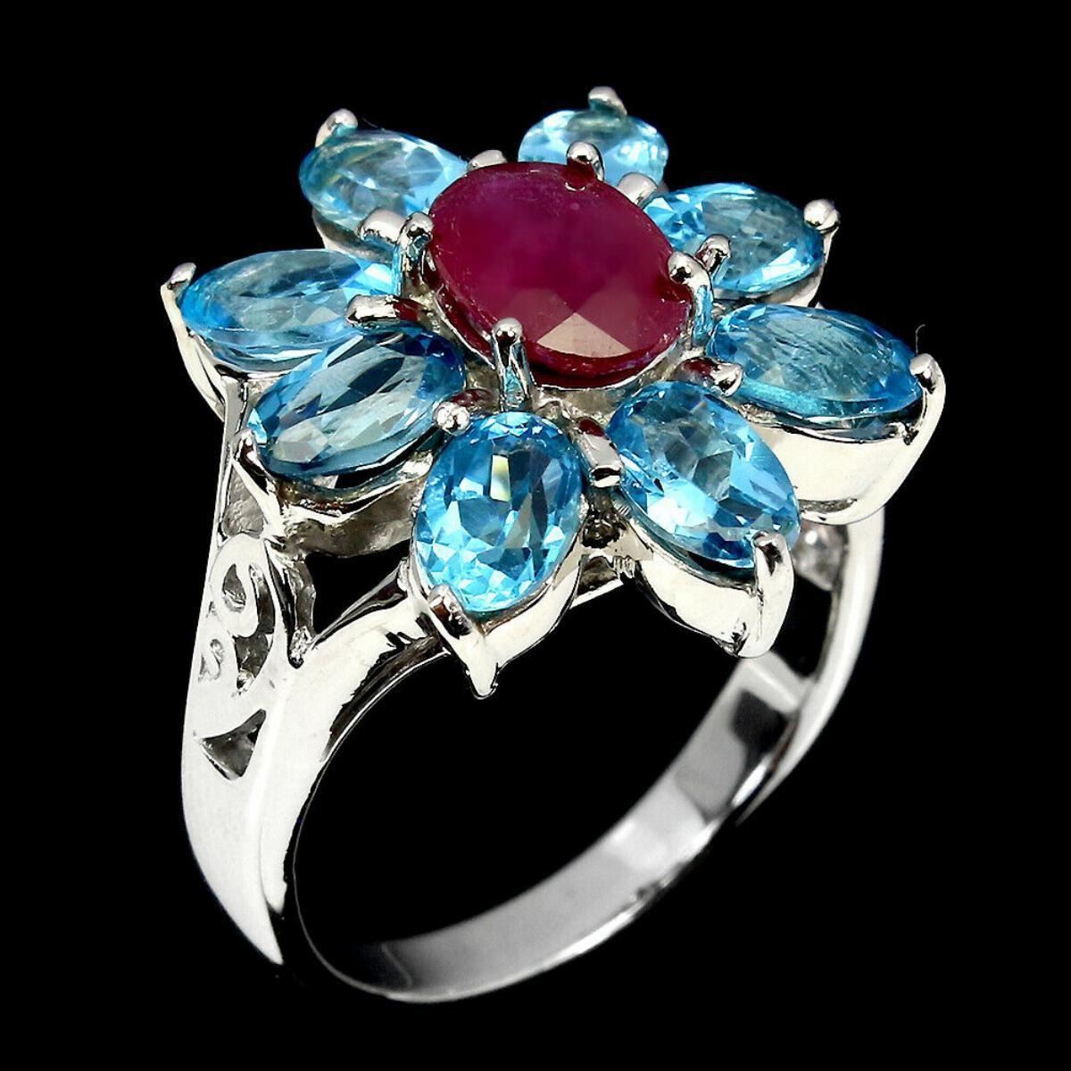 925 STERLING SILVER;PLATE-14K WHITE GOLD;RING SIZE/resizeable-9;MAIN STONE-RUBY;OTHER GEMS-SWISS BLUE TOPAZ;;TOTAL WEIGHT-8.34 GRAM (TOTAL WEIGHT OF SILVER + STONE)DIMENSION-* STONE 6.0 X 4.0 TO 8.0 X 6.0 MM. * RING SIZE 9.0 * FACE RING -21.0 X 20.0 MM.;MAIN STONE SHAPE-OVAL CUT;MAIN STONE COLOR-TOP BLOOD RED;TREATMENT-Yes;ORIGIN-MADAGASCAR;HARDNESS-9;