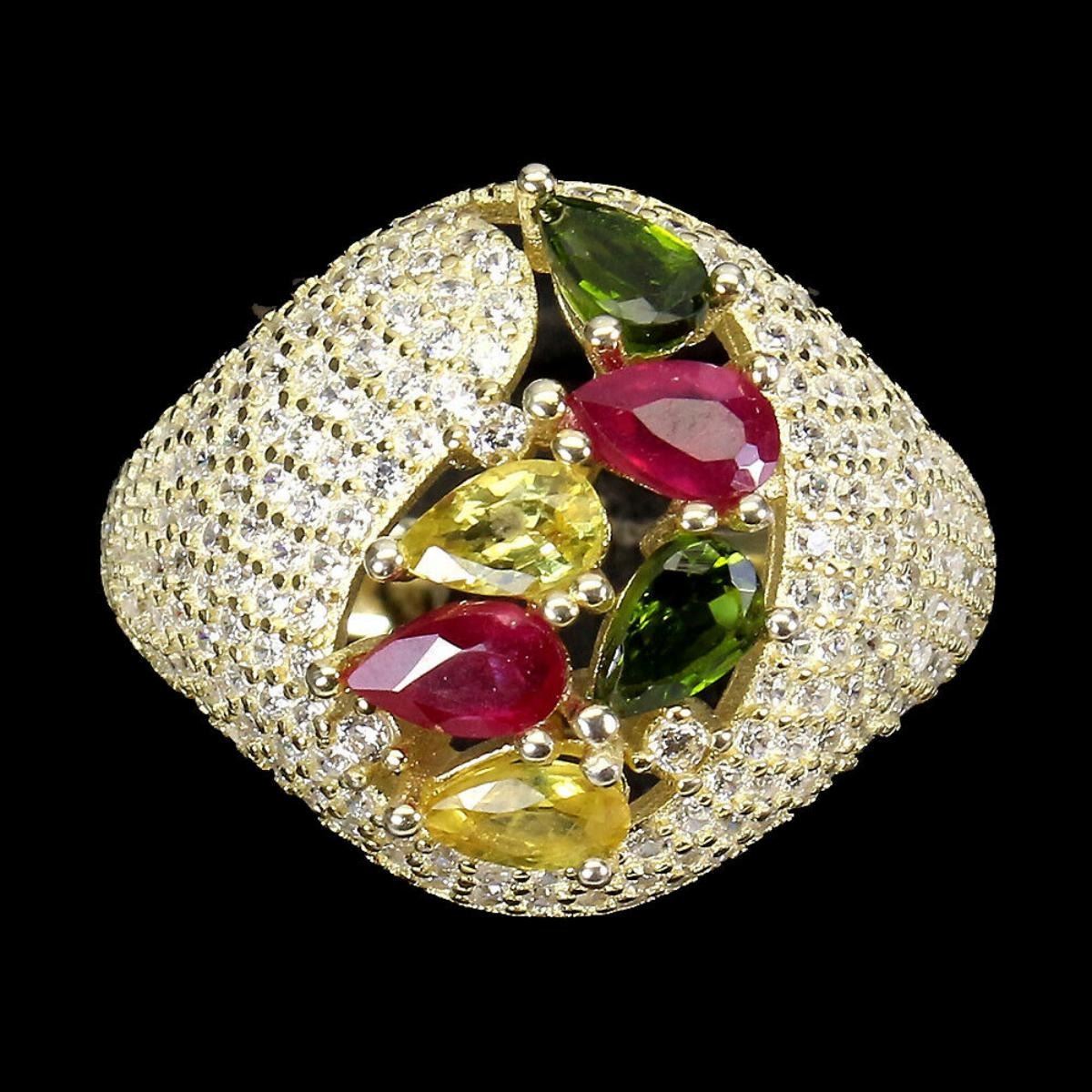 925 STERLING SILVER;PLATE-14K YELLOW GOLD;RING SIZE/resizable-7;MAIN STONE-TOURMALINE;TOTAL WEIGHT-6.07 GRAM (TOTAL WEIGHT OF SILVER + STONE)DIMENSION-* STONE 5.0 X 3.0 MM. * CZ 1.0 MM. * RING SIZE 7.0 * FACE RING- 22.0 X 18.0 MM.MAIN STONE SHAPE-PE;AR CUT;MAIN STONE COLOR-MULTI-COLOR;CLARITY/GRADE-IF TO VVS;;TREATMENT-UNHEATED;ORIGIN-BRAZIL;HARDNESS-7.0-7.5;