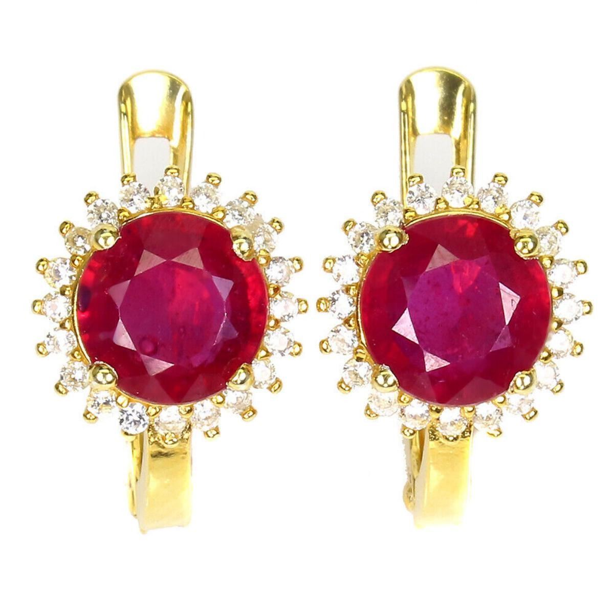 925 STERLING SILVER;PLATE-14K YELLOW GOLD;MAIN STONE-RUBY;OTHER GEMS-WHITE TOPAZ;TOTAL WEIGHT-2.85 GRAM (TOTAL WEIGHT OF SILVER + STONE);DIMENSION-* STONE 1.0 TO 7.0 MM.* FACE EARRINGS 14.0 X 10.0 MM.;MAIN STONE SHAPE-ROUND; MAIN STONE COLOR- RED; TREATMENT- YES;ORIGIN-MOZAMBIQUE;HARDNESS-9.0;