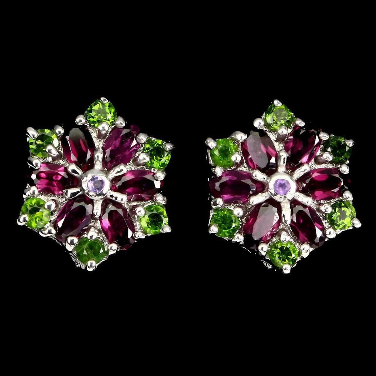 925 STERLING SILVER;PLATE-14K WHITE GOLD;MAIN STONE-RHODOLITE GARNET;OTHER GEMS-AMETHYST, CHROME DIOPSIDE;TOTAL WEIGHT-7.98 GRAM (TOTAL WEIGHT OF SILVER + STONE)DIMENSION-* STONE 1.5 TO 5.0 X 3.0 MM. * FACE EARRINGS 17.0 X 15.0 MM.;MAIN STONE SHAPE-OVAL CUT;MAIN STONE COLOR-TOP RICH PINK RASPBERRY;CLARITY/GRADE-IF TO VVS;LUSTER-GORGEOUS;TREATMENT-UNHEATED;ORIGIN-AFRICA;HARDNESS-5.0 - 7.5;