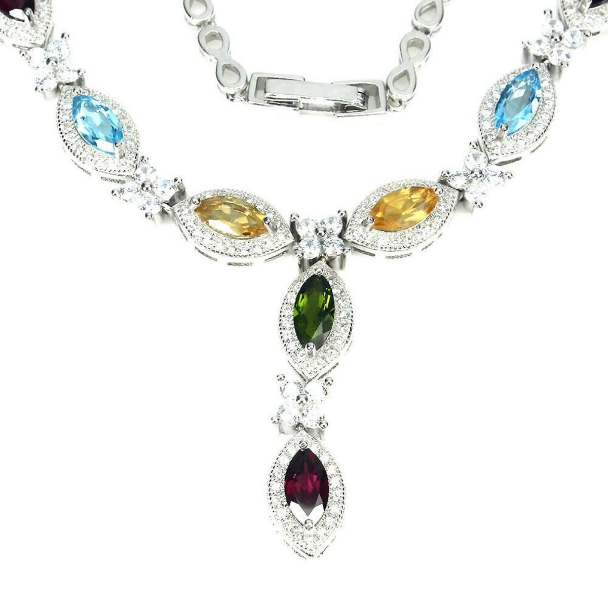 925 STERLING SILVER;PLATE-14K WHITE GOLD;LENGTH (INCHES)18;MAIN STONE-RHODOLITE GARNET;OTHER GEMS-AMETHYST, CHROME DIOPSIDE, SKY BLUE TOPAZ;TOTAL WEIGHT26.88 GRAM (TOTAL WEIGHT OF SILVER + STONE)DIMENSION* STONE 8.0 X 4.0 MM. * CZ 1.0 TO 2.0 MM. * STONES PART LENGTH 175.0 X 36.0 MM.;MAIN STONE SHAPE-MARQUISE CUTMAIN STONE COLOR-TOP RICH PINK RASPBERRY;CLARITY/GRADE-IF TO VVS;TREATMENT-UNHEATED;ORIGIN-AFRICA;HARDNESS-7.0 - 7.5;