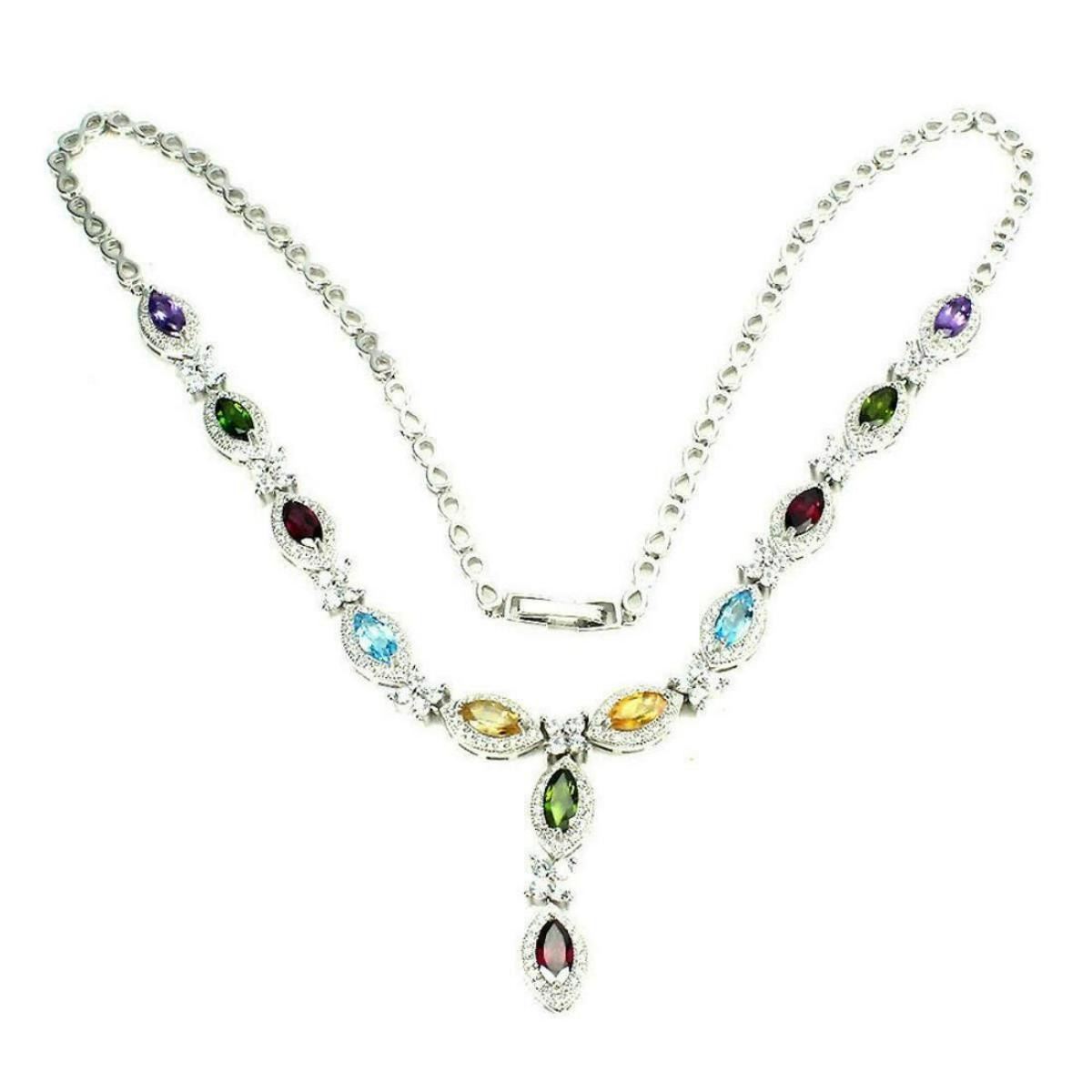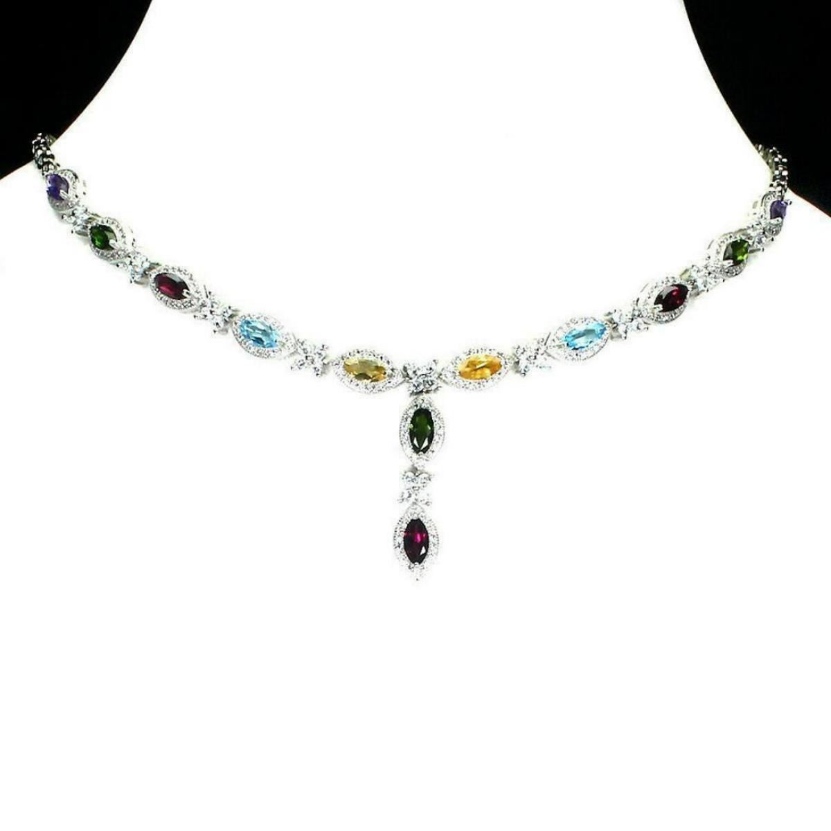 925 STERLING SILVER;PLATE-14K WHITE GOLD;LENGTH (INCHES)18;MAIN STONE-RHODOLITE GARNET;OTHER GEMS-AMETHYST, CHROME DIOPSIDE, SKY BLUE TOPAZ;TOTAL WEIGHT26.88 GRAM (TOTAL WEIGHT OF SILVER + STONE)DIMENSION* STONE 8.0 X 4.0 MM. * CZ 1.0 TO 2.0 MM. * STONES PART LENGTH 175.0 X 36.0 MM.;MAIN STONE SHAPE-MARQUISE CUTMAIN STONE COLOR-TOP RICH PINK RASPBERRY;CLARITY/GRADE-IF TO VVS;TREATMENT-UNHEATED;ORIGIN-AFRICA;HARDNESS-7.0 - 7.5;