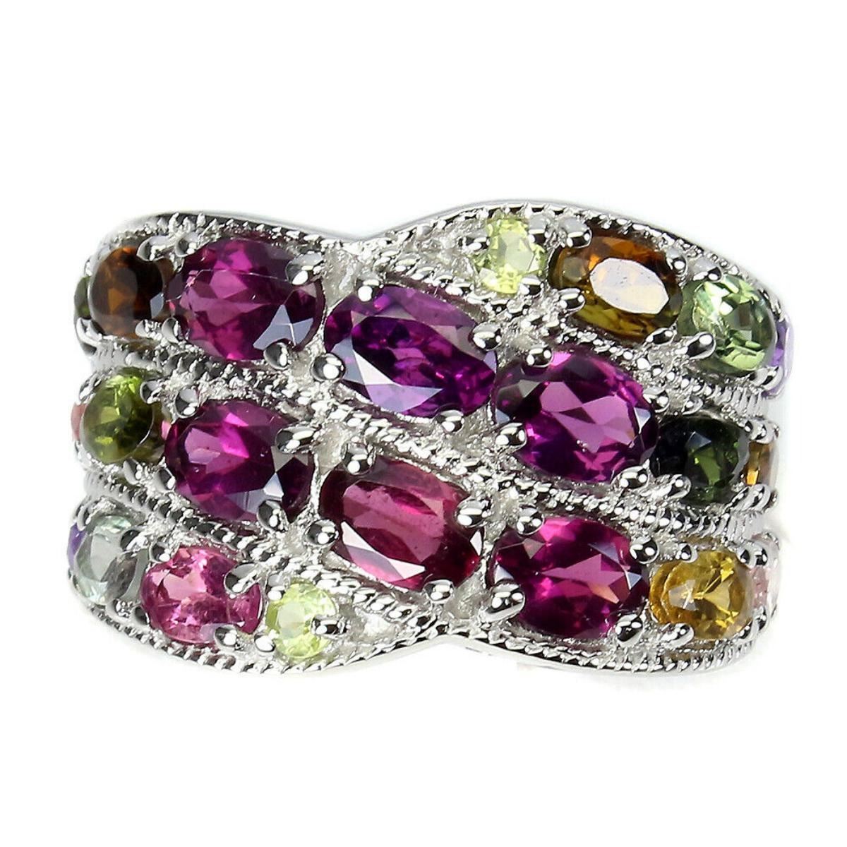 925 STERLING SILVER;PLATE-14K WHITE GOLD;RING SIZE/resizable-8;MAIN STONE-RHODOLITE GARNET;;OTHER GEMS-AMETHYST, PERIDOT, TOURMALINE;TOTAL WEIGHT-9.69 GRAM (TOTAL WEIGHT OF SILVER + STONE);DIMENSION-* STONE 2.5 TO 6.0 X 4.0 MM.;* FACE RING- 25.0 X 16.0 MM.;MAIN STONE SHAPE-OVAL CUT;MAIN STONE COLOR- PINK RASPBERRY;CLARITY/GRADE-IF TO VVS;TREATMENT-UNHEATED;ORIGIN-AFRICA;HARDNESS-7.0 - 7.5;