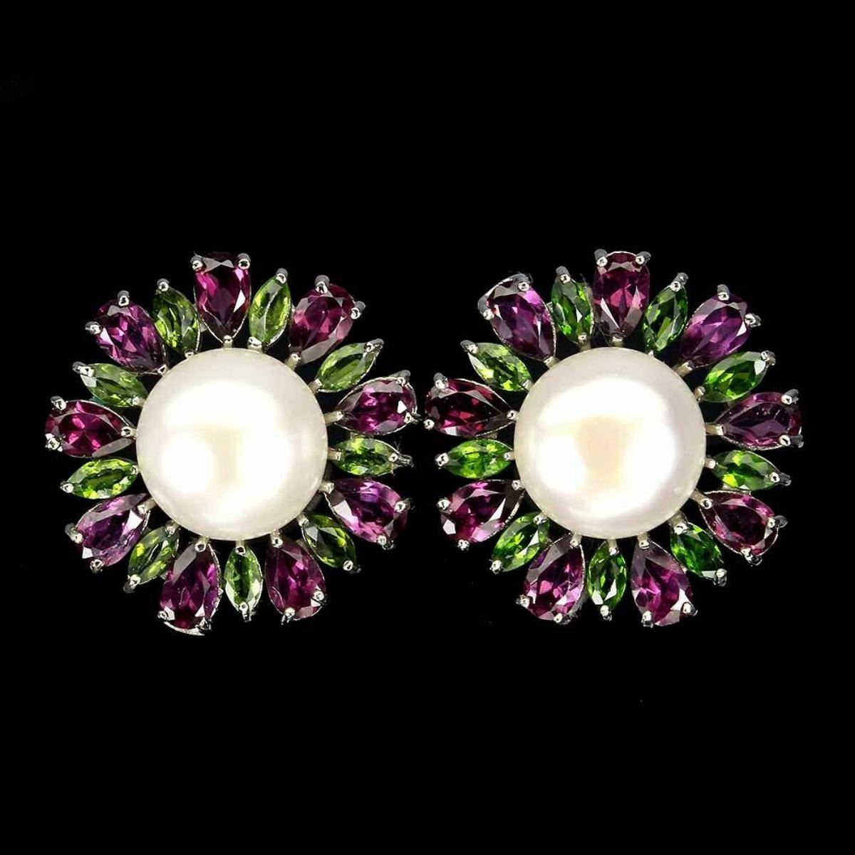 Natural Rhodolite Garnet, Ch-Diopside & Pearl Earrings
