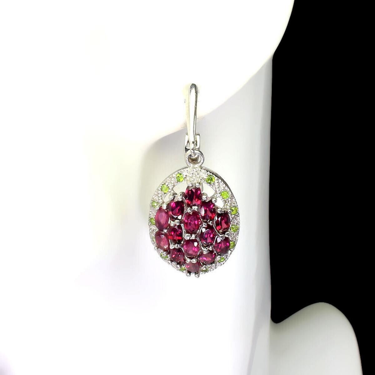 925 STERLING SILVER;PLATE-14K WHITE GOLD;MAIN STONE-RHODOLITE GARNET;OTHER GEMS-CHROME DIOPSIDE;TOTAL WEIGHT-10.58 GRAM (TOTAL WEIGHT OF SILVER + STONE);DIMENSION-* STONE 1.5 TO 5.0 X 3.0 MM.* FACE EARRINGS 40.0 X 18.0 MM.;MAIN STONE SHAPE-OVAL CUT;MAIN STONE COLOR-PINK RASPBERRY;CLARITY/GRADE-IF TO VVS;TREATMENT-UNHEATED;ORIGIN-AFRICA;HARDNESS-7.0 - 7.5;