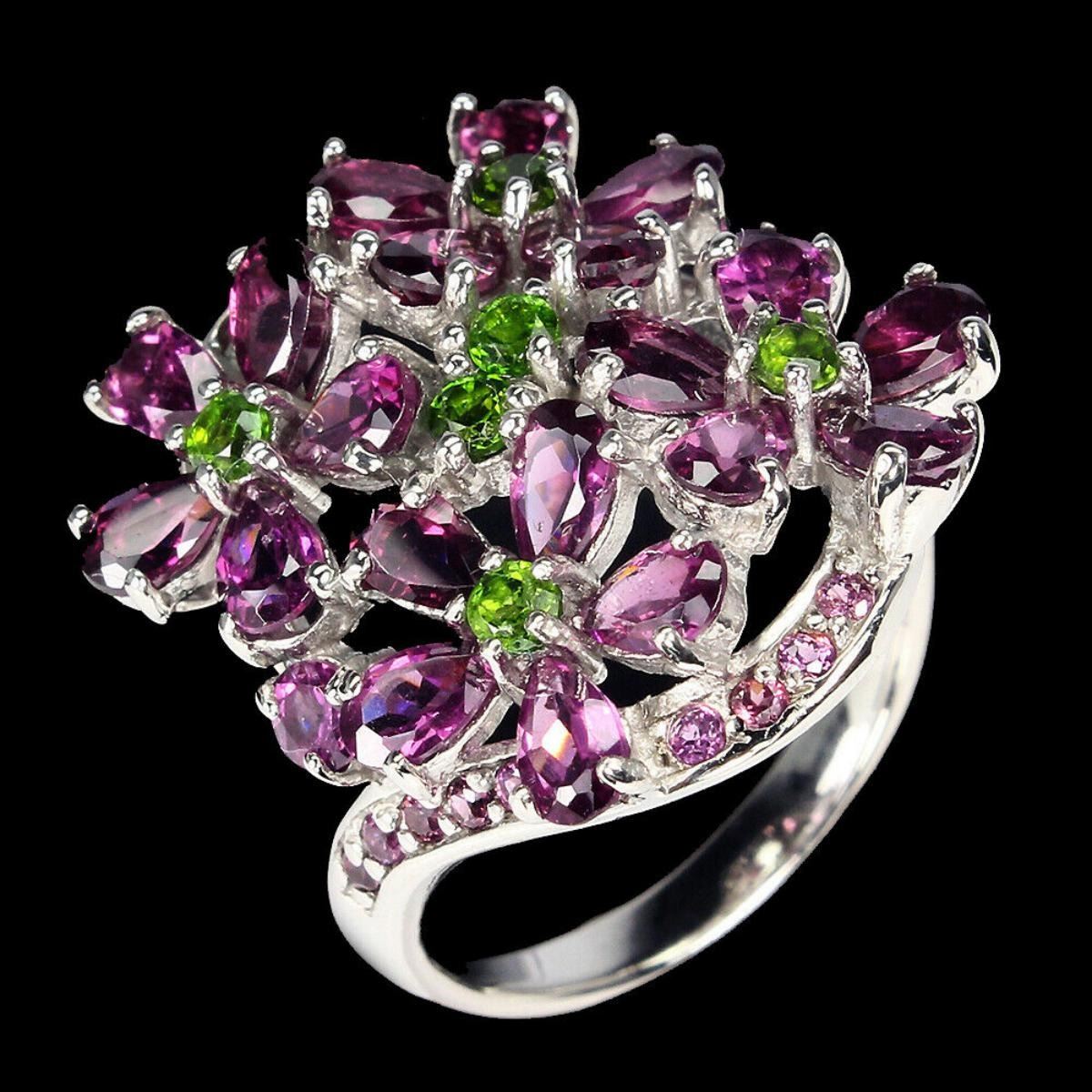 925 STERLING SILVER;PLATE-14K WHITE GOLD;RING SIZE/resizeable-8;MAIN STONE-RHODOLITE GARNET;OTHER GEMS-CHROME DIOPSIDE;TOTAL WEIGHT-7.65 GRAM (TOTAL WEIGHT OF SILVER + STONE)DIMENSION-* STONE 1.5 TO 5.0 X 3.0 MM. * RING SIZE 8.0 * FACE RING 25.0 X 21.0 MM.;MAIN STONE SHAPE-PEAR CUT;MAIN STONE COLOR-TOP RICH PINK RASPBERRY;CLARITY/GRADE-IF TO VVS;TREATMENT-UNHEATED;ORIGIN-AFRICA;HARDNESS-7.0 - 7.5;