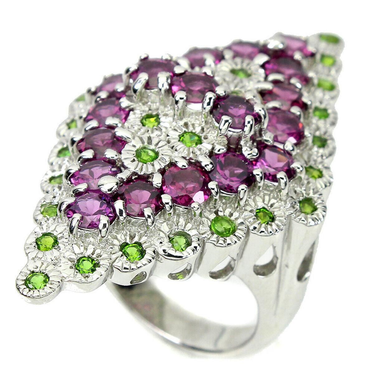 925 STERLING SILVER;PLATE-14K WHITE GOLD;RING SIZE/resizeable-8;MAIN STONE-RHODOLITE GARNET;OTHER GEMS-CHROME DIOPSIDE;TOTAL WEIGHT-12.18 GRAM (TOTAL WEIGHT OF SILVER + STONE)DIMENSION-* STONE 1.5 TO 3.5 MM.;* RING SIZE- 8.0;* FACE RING- 42.0 X 25.0 MM.;MAIN STONE SHAPE-ROUND CUT;MAIN STONE COLOR-PINK RASPBERRY;CLARITY/GRADE-IF;TREATMENT-UNHEATED;ORIGIN-AFRICA;HARDNESS-7.0 - 7.5;