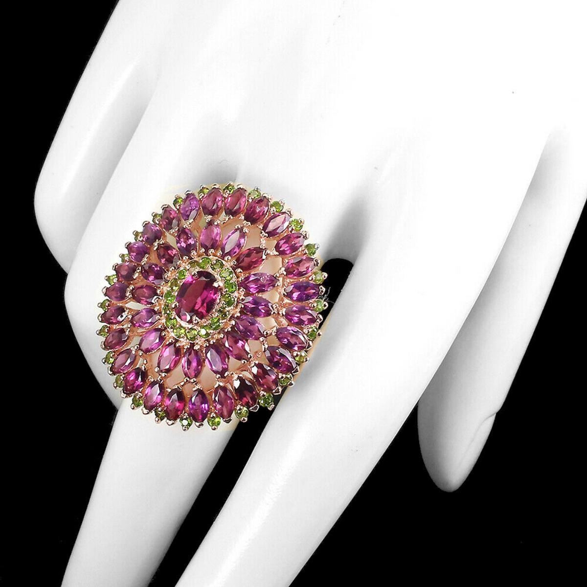925 STERLING SILVER;PLATE-14K ROSE GOLD;RING SIZE(resizeable)8.5;MAIN STONE-RHODOLITE GARNET;OTHER GEMS-CHROME DIOPSIDE;TOTAL WEIGHT-9.06 GRAM (TOTAL WEIGHT OF SILVER + STONE)DIMENSION-* STONE 1.5 TO 7.0 X 5.0 MM. * RING SIZE 8.5 * FACE RING -33.0 X 29.0 MM.;MAIN STONE SHAPE-OVAL CUT;MAIN STONE COLOR- PINK RASPBERRY;CLARITY/GRADE-IF TO VVS;TREATMENT-UNHEATED;ORIGIN-AFRICA;HARDNESS-7.0 - 7.5;