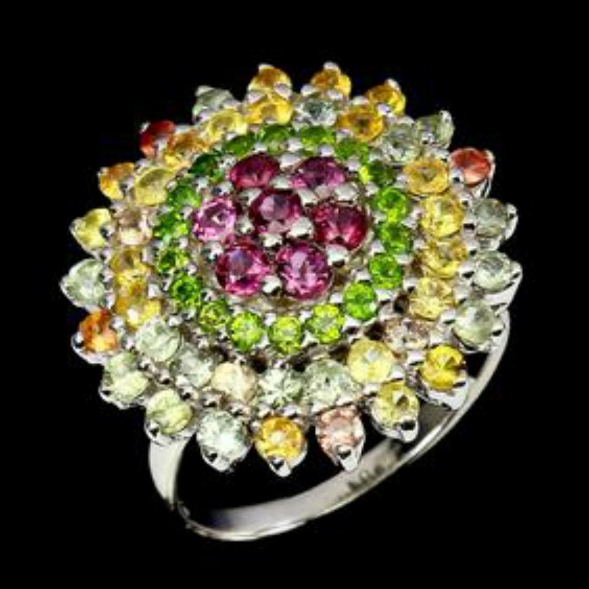 925 STERLING SILVER;PLATE-14K WHITE GOLD;RING SIZE-8(resizeable)MAIN STONE-RHODOLITE GARNET;OTHER GEMS-CHROME DIOPSIDE, SAPPHIRE;TOTAL WEIGHT-6.71 GRAM (TOTAL WEIGHT OF SILVER + STONE)DIMENSION-* STONE 1.5 TO 2.5 MM. * RING SIZE 8.0 * FACE RING 22.0 X 22.0 MM.;MAIN STONE SHAPE-ROUND CUT;MAIN STONE COLOR-RICH PINK RASPBERRY;CLARITY/GRADE-IF TO VVS;TREATMENT-UNHEATED;ORIGIN-AFRICA;HARDNESS-7.0 - 7.5;