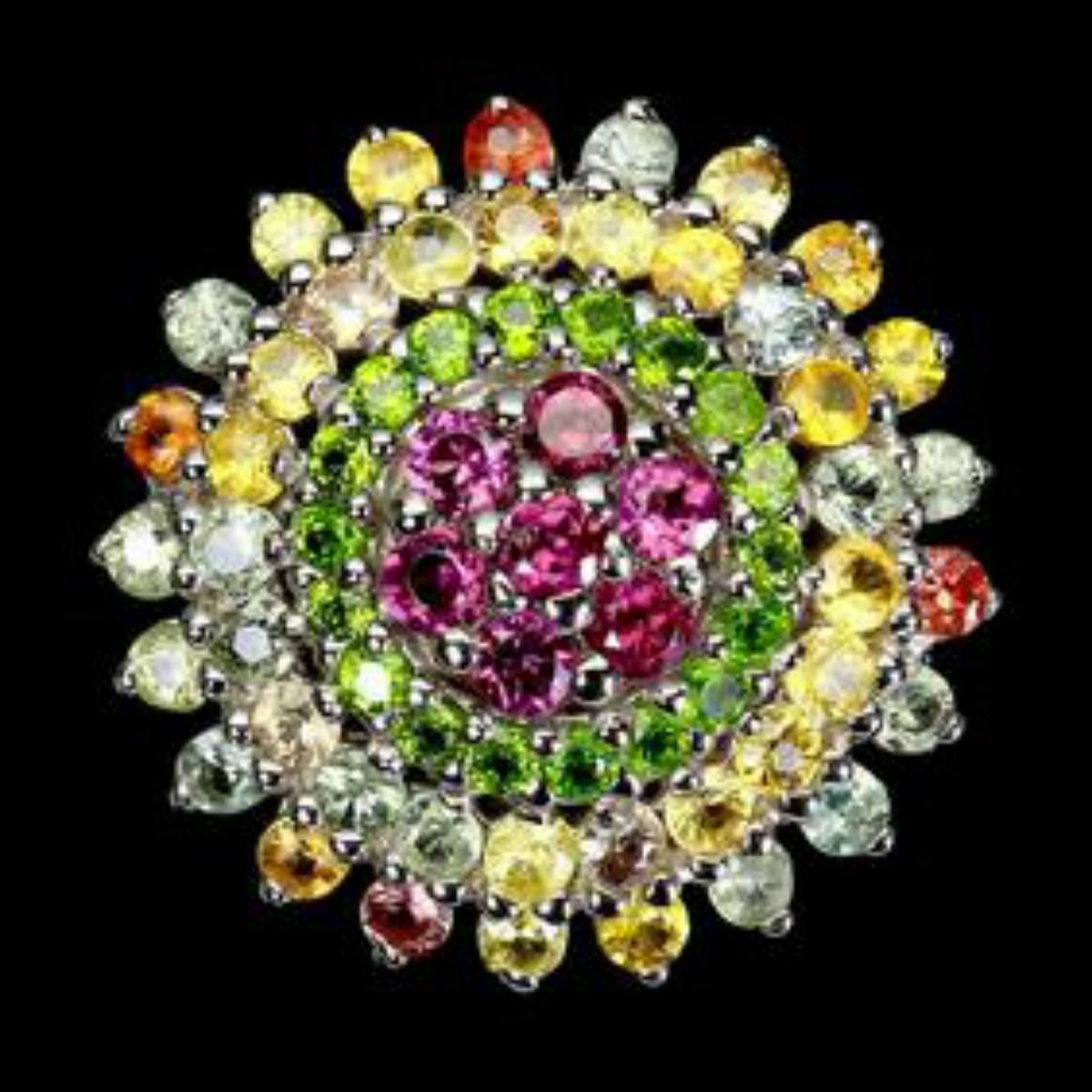 925 STERLING SILVER;PLATE-14K WHITE GOLD;RING SIZE-8(resizeable)MAIN STONE-RHODOLITE GARNET;OTHER GEMS-CHROME DIOPSIDE, SAPPHIRE;TOTAL WEIGHT-6.71 GRAM (TOTAL WEIGHT OF SILVER + STONE)DIMENSION-* STONE 1.5 TO 2.5 MM. * RING SIZE 8.0 * FACE RING 22.0 X 22.0 MM.;MAIN STONE SHAPE-ROUND CUT;MAIN STONE COLOR-RICH PINK RASPBERRY;CLARITY/GRADE-IF TO VVS;TREATMENT-UNHEATED;ORIGIN-AFRICA;HARDNESS-7.0 - 7.5;