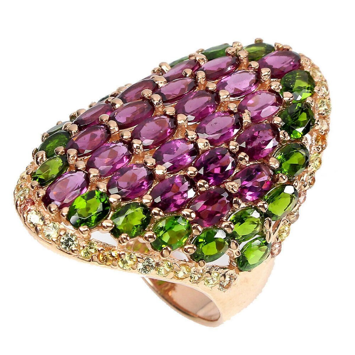 925 STERLING SILVER;PLATE-14K ROSE GOLD;RING SIZE-9(resizeable)MAIN STONE-RHODOLITE GARNET;OTHER GEMS-CHROME DIOPSIDE, SAPPHIRE;TOTAL WEIGHT-9.29 GRAM (TOTAL WEIGHT OF SILVER + STONE)DIMENSION-* STONE 1.5 TO 5.0 X 3.0 MM. * RING SIZE 9.0 * FACE RING- 34.0 X 24.0 MM.;MAIN STONE SHAPE-OVAL CUT;MAIN STONE COLOR- PINK RASPBERRY;CLARITY/GRADE-IF TO VVS;LUSTER-GORGEOUS;TREATMENT-UNHEATED;ORIGIN-AFRICA;HARDNESS-7.0 - 7.5;