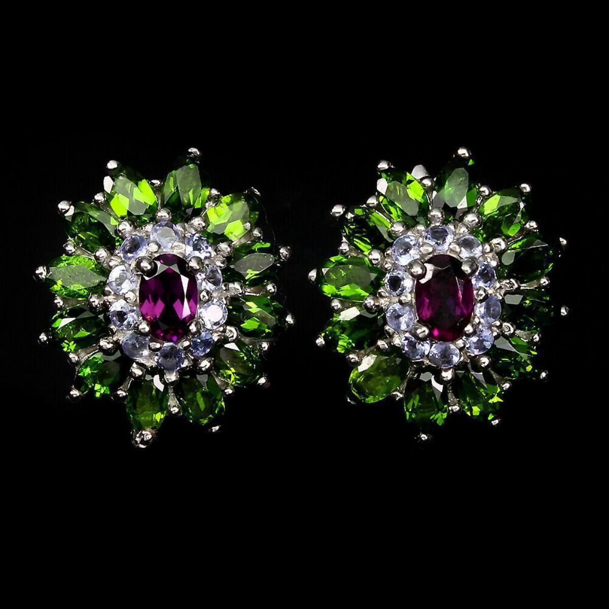 925 STERLING SILVER;PLATE-14K WHITE GOLD;MAIN STONE-RHODOLITE GARNET;OTHER GEMS-CHROME DIOPSIDE, TANZANITE;TOTAL WEIGHT-9.69 GRAM (TOTAL WEIGHT OF SILVER + STONE)DIMENSION* STONE 2.0 TO 6.0 X 4.0 MM. * FACE EARRINGS 21.0 X 19.0 MM.;MAIN STONE SHAPE-OVAL CUT;MAIN STONE COLOR-TOP RICH PINK RASPBERRY;CLARITY/GRADE-IF TO VVS;TREATMENT-UNHEATED;ORIGIN-AFRICA;HARDNESS-7.0 - 7.5;