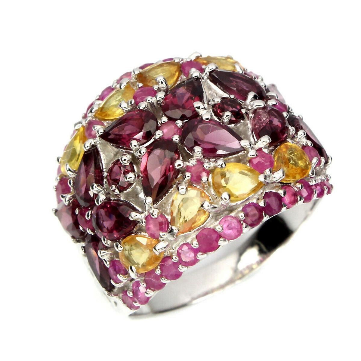 925 STERLING SILVER;PLATE-14K WHITE GOLD;RING SIZE-8.5 (resizeable);MAIN STONE-RHODOLITE GARNET;OTHER GEMS-CITRINE,RUBY;TOTAL WEIGHT-33.58 CT (TOTAL WEIGHT OF SILVER + STONE)DIMENSION* STONE 1.5 TO 5.0 X 3.0 MM. * RING SIZE 8.5 * FACE RING 20.0 X18.0 MM.;MAIN STONE SHAPE-PEAR CUT;MAIN STONE COLOR--TOP RICH PINK;CLARITY/GRADE-IF TO VVS;TREATMENT-UNHEATED;ORIGIN-AFRICA;