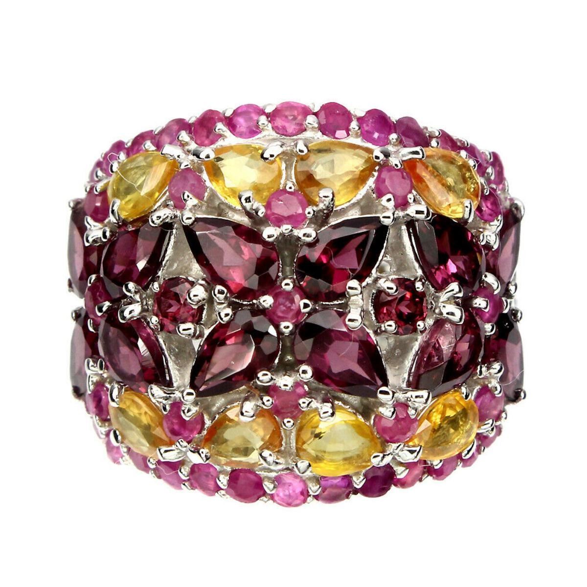 925 STERLING SILVER;PLATE-14K WHITE GOLD;RING SIZE-8.5 (resizeable);MAIN STONE-RHODOLITE GARNET;OTHER GEMS-CITRINE,RUBY;TOTAL WEIGHT-33.58 CT (TOTAL WEIGHT OF SILVER + STONE)DIMENSION* STONE 1.5 TO 5.0 X 3.0 MM. * RING SIZE 8.5 * FACE RING 20.0 X18.0 MM.;MAIN STONE SHAPE-PEAR CUT;MAIN STONE COLOR--TOP RICH PINK;CLARITY/GRADE-IF TO VVS;TREATMENT-UNHEATED;ORIGIN-AFRICA;