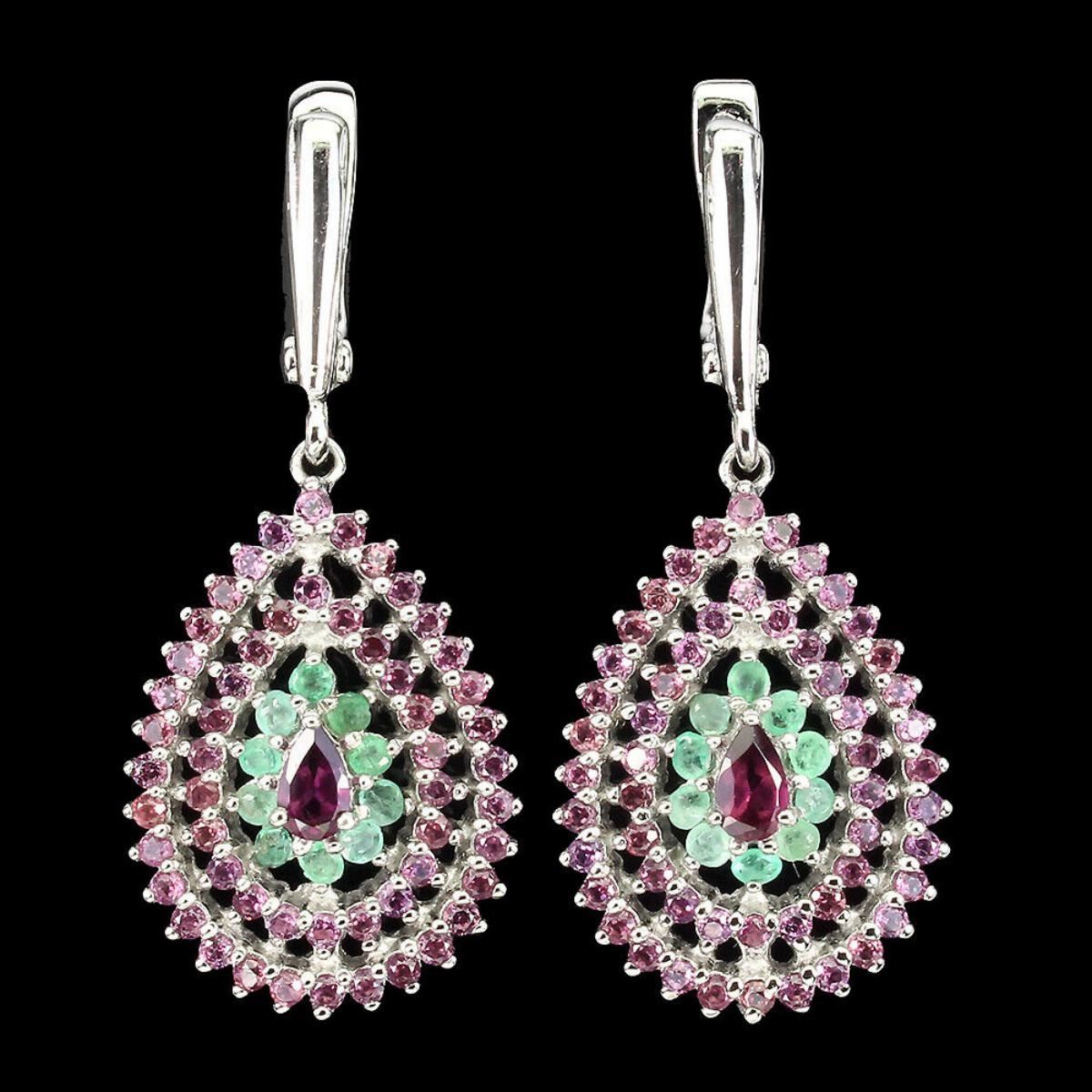 925 STERLING SILVER;PLATE-14K WHITE GOLD;MAIN STONE-RHODOLITE GARNET;OTHER GEMS-EMERALD;TOTAL WEIGHT-6.98 GRAM (TOTAL WEIGHT OF SILVER + STONE);DIMENSION-* STONE 1.5 TO 5.0 X 3.0 MM. * FACE EARRINGS 38.0 X 17.0 MM.;MAIN STONE SHAPE-PEAR; MAIN STONE COLOR-PINK RASPBERRY;CLARITY/GRADE-IF TO VVS;TREATMENT-UNHEATED;ORIGIN-AFRICA;HARDNESS-7.0 - 7.5;