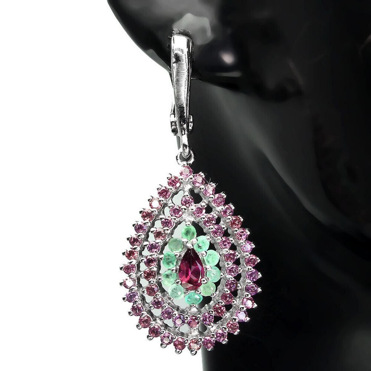 925 STERLING SILVER;PLATE-14K WHITE GOLD;MAIN STONE-RHODOLITE GARNET;OTHER GEMS-EMERALD;TOTAL WEIGHT-6.98 GRAM (TOTAL WEIGHT OF SILVER + STONE);DIMENSION-* STONE 1.5 TO 5.0 X 3.0 MM. * FACE EARRINGS 38.0 X 17.0 MM.;MAIN STONE SHAPE-PEAR; MAIN STONE COLOR-PINK RASPBERRY;CLARITY/GRADE-IF TO VVS;TREATMENT-UNHEATED;ORIGIN-AFRICA;HARDNESS-7.0 - 7.5;