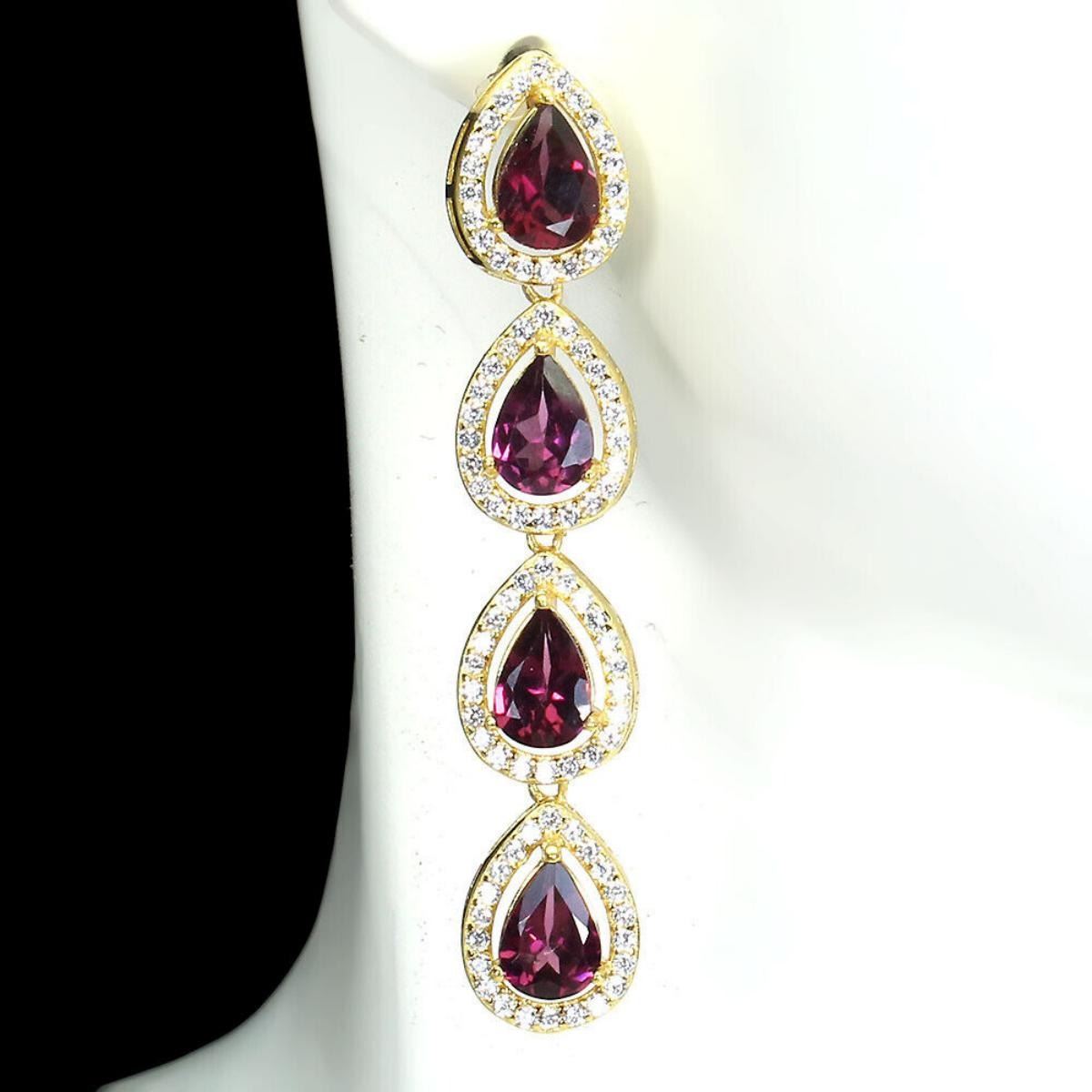 925 STERLING SILVER;PLATE-14K YELLOW GOLD;MAIN STONE-RHODOLITE GARNET;TOTAL WEIGHT-7.14 GRAM (TOTAL WEIGHT OF SILVER + STONE)DIMENSION-* STONE 7.0 X 5.0 MM. * CZ 1.0 MM. * FACE EARRINGS 46.0 X 9.0 MM.;MAIN STONE SHAPE-PEAR CUT;MAIN STONE COLOR-PINK RASPBERRY;CLARITY/GRADE-IF TO VVS;TREATMENT-UNHEATED;ORIGIN-BRAZIL;HARDNESS-7.0 - 7.5;