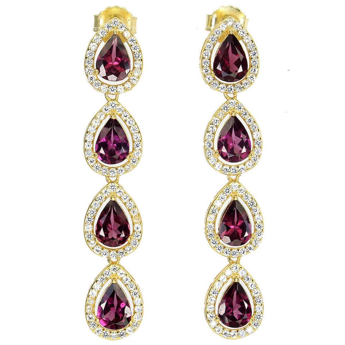 925 STERLING SILVER;PLATE-14K YELLOW GOLD;MAIN STONE-RHODOLITE GARNET;TOTAL WEIGHT-7.14 GRAM (TOTAL WEIGHT OF SILVER + STONE)DIMENSION-* STONE 7.0 X 5.0 MM. * CZ 1.0 MM. * FACE EARRINGS 46.0 X 9.0 MM.;MAIN STONE SHAPE-PEAR CUT;MAIN STONE COLOR-PINK RASPBERRY;CLARITY/GRADE-IF TO VVS;TREATMENT-UNHEATED;ORIGIN-BRAZIL;HARDNESS-7.0 - 7.5;