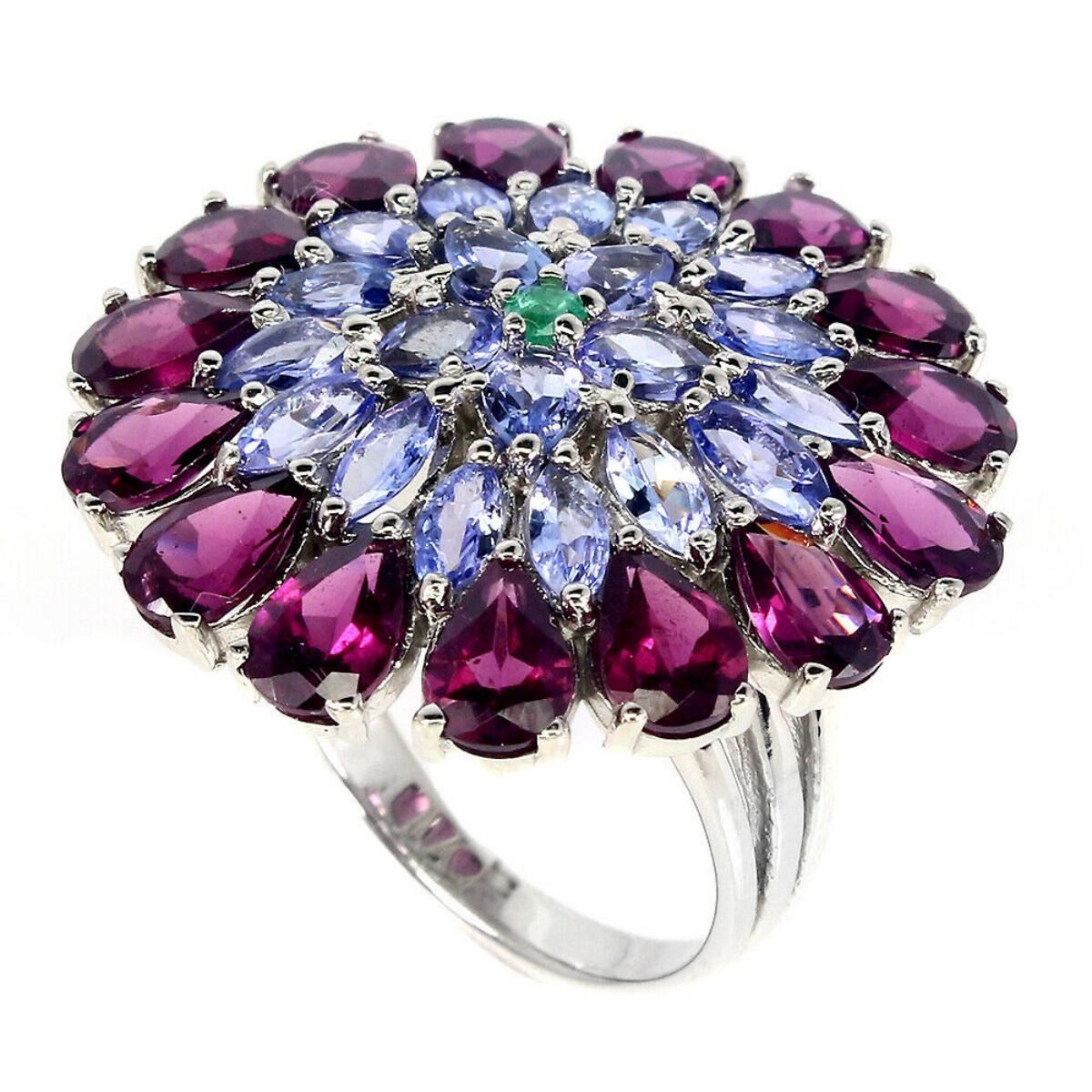 925 STERLING SILVER;PLATE-14K WHITE GOLD;RING SIZE(resizeable)8;MAIN STONE-RHODOLITE GARNET;OTHER GEMS-EMERALD, TANZANITE;TOTAL WEIGHT-9.93 GRAM (TOTAL WEIGHT OF SILVER + STONE)DIMENSION-* STONE 2.0 TO 6.0 X 4.0 MM. * RING SIZE 8.0 * FACE RING- 27.0 X 27.0 MM.;MAIN STONE SHAPE-PEAR CUT;MAIN STONE COLOR- PINK RASPBERRY;CLARITY/GRADE-IF TO VVS;TREATMENT-UNHEATED;ORIGIN-AFRICA;