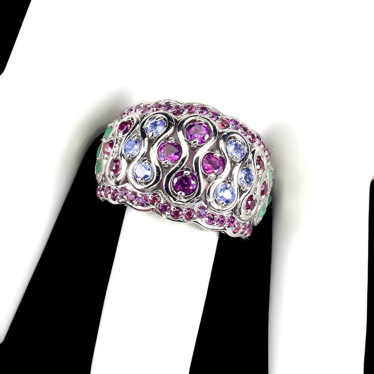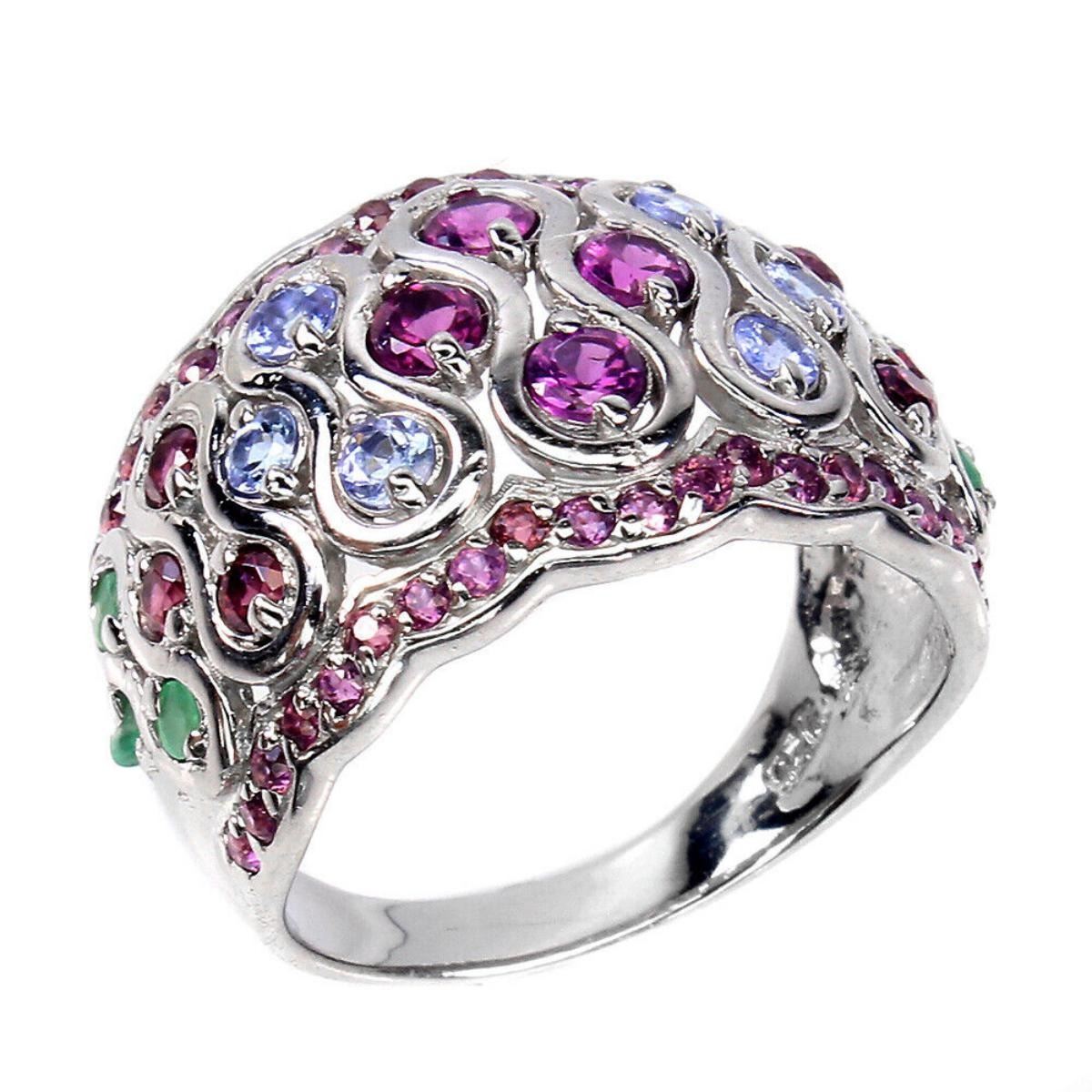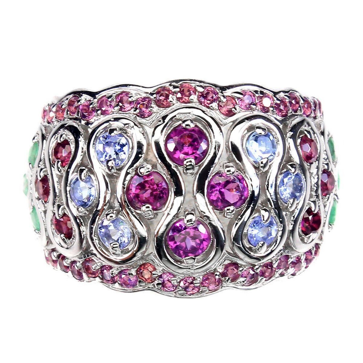 925 STERLING SILVER;PLATE-14K WHITE GOLD;RING SIZE/resizable-9;MAIN STONE-RHODOLITE GARNET;OTHER GEMS-EMERALD, TANZANITE;TOTAL WEIGHT-7.03 GRAM (TOTAL WEIGHT OF SILVER + STONE)DIMENSION-* STONE 1.5 TO 3.5 MM.;* FACE RING- 24.0 X 17.0 MM.;MAIN STONE SHAPE-ROUND CUT;MAIN STONE COLOR-TOP RICH PINK RASPBERRY;CLARITY/GRADE-IF TO VVS;TREATMENT-UNHEATED;ORIGIN-AFRICA;HARDNESS-7.0 - 7.5;