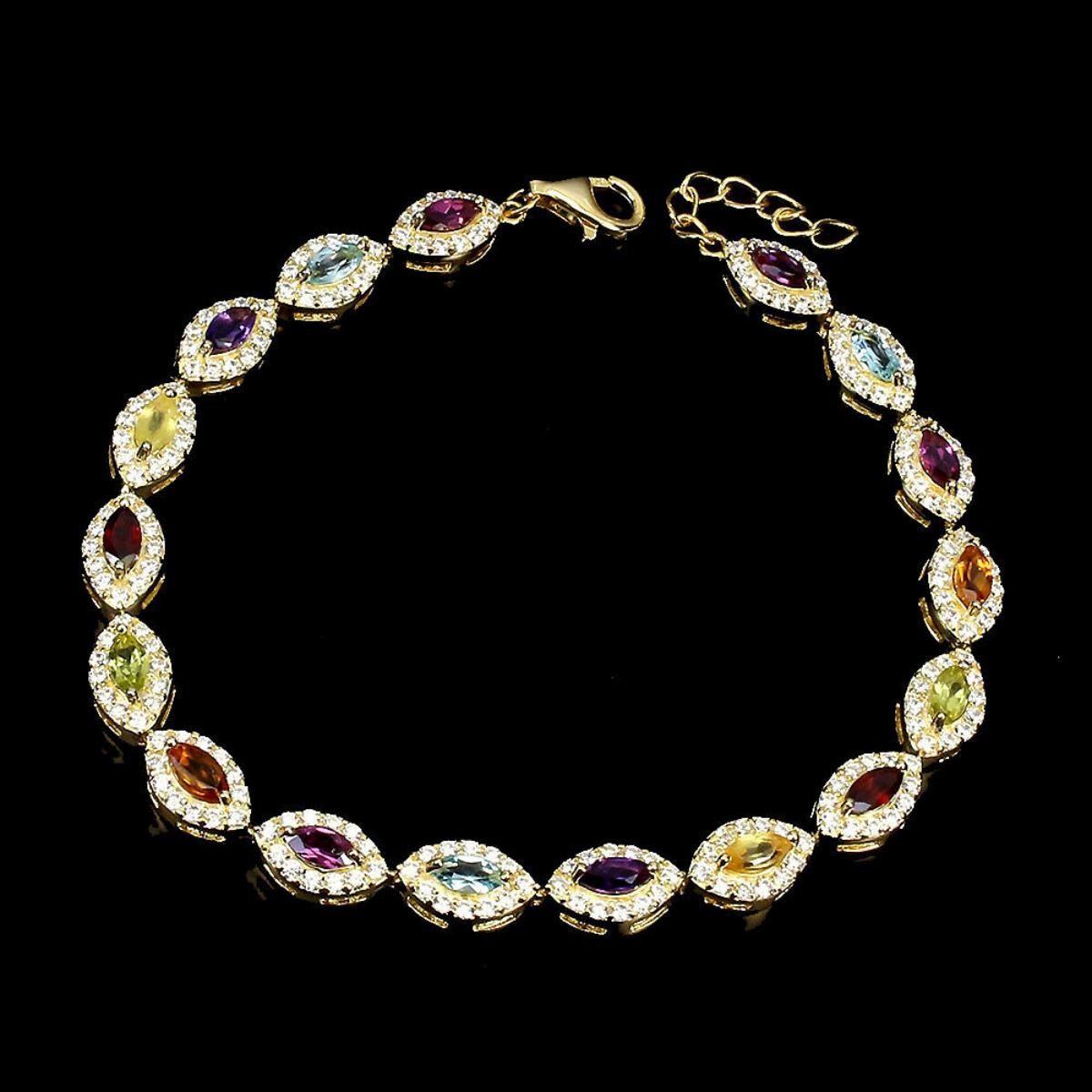 925 STERLING SILVER;PLATE-14K YELLOW GOLD;LENGTH (INCHES)7.5;MAIN STONE--RHODOLITE GARNET;OTHER GEMS-AMETHYST, MOZAMBIQUE GARNET, PERIDOT, SAPPHIRE;TOTAL WEIGHT-10.01 GRAM (TOTAL WEIGHT OF SILVER + STONE)DIMENSION-* STONE 5.0 X 2.5 MM.;* LENGTH 7.5 INCHES.* FACE BRACELET 160.0 X 6.0 MM.;MAIN STONE SHAPE-MARQUISE CUT;MAIN STONE COLOR-PINK RASPBERRY;CLARITY/GRADE-IF TO VVS;TREATMENT-UNHEATED;ORIGIN-AFRICA;HARDNESS-7.0 - 7.5;